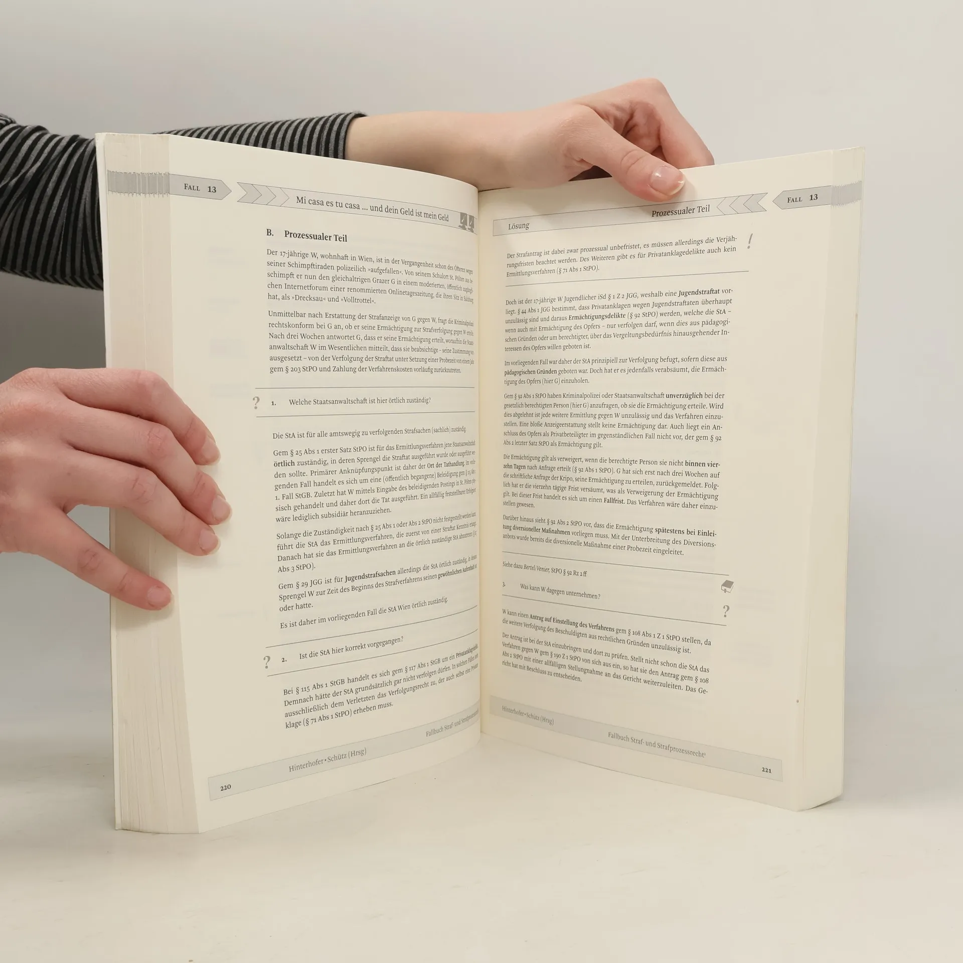 Das von Vortragenden an fünf österreichischen Universitäten zusammengestellte Übungsbuch enthält 24 Fälle in drei Schwierigkeitsstufen samt Lösungen, zahlreichen ergänzenden Erläuterungen und weiterführenden Hinweisen für Studierende der Rechtswissenschaften und alle, die ihre Kenntnisse auffrischen müssen. FALLGESTALTER: Christian Bergauer, Alois Birklbauer, Petra Deutsch, Milan Djordjevic, Robert Durl, Severin Glaser, Hubert Hinterhofer, Robert Kert, Benjamin Koller, Viktoria Moser, Farsam Salimi, Hannes Schütz, Florian Sprajc und Alexander Tipold