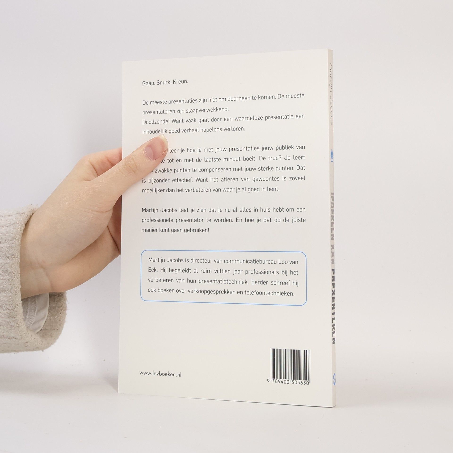 Gaap. Snurk. Kreun. De meeste presentaties zijn niet om doorheen te komen. De meeste presentatoren zijn slaapverwekkend. Doodzonde! Want vaak gaat door een waardeloze presentatie een inhoudelijk goed verhaal hopeloos verloren. In dit boek leer je hoe je met jouw presentaties jouw publiek van de eerste tot en met de laatste minuut boeit. De truc? Je leert jouw zwakke punten te compenseren met jouw sterke punten. Dat is bijzonder effectief. Want het afleren van gewoontes is zoveel moeilijker dan het verbeteren van waar u al goed in bent. Martijn Jacobs laat u zien dat je nu al alles in huis hebt om een professionele presentator te worden. En hoe je dat op de juiste manier kunt gaan gebruiken!