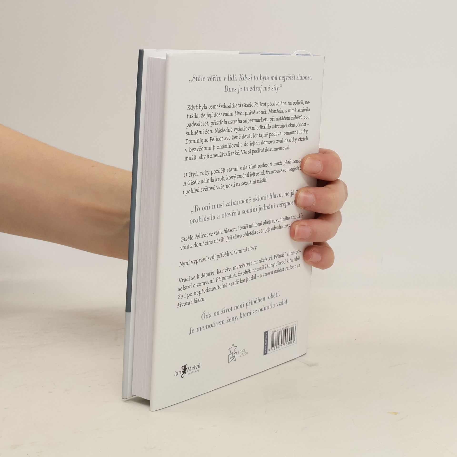 Óda na život není příběhem oběti.Je memoárem ženy, která se odmítla vzdát.Když byla osmašedesátiletá Gisèle Pelicot předvolána na policii, netušila, že její dosavadní život právě končí. Manžela, s nímž strávila padesát let, přistihla ostraha supermarketu při natáčení záběrů pod sukněmi žen. Následné vyšetřování odhalilo zdrcující skutečnost ⁠⁠⁠⁠⁠⁠⁠⁠⁠⁠⁠⁠⁠⁠⁠⁠– Dominique Pelicot své ženě devět let tajně podával omamné látky, v bezvědomí ji znásilňoval a do jejich domova zval desítky cizích mužů, aby ji zneužívali také. Vše si pečlivě dokumentoval.O čtyři roky později stanul s dalšími padesáti muži před soudem. A Gisèle učinila krok, který změnil její osud, francouzskou legislativu i pohled světové veřejnosti na sexuální násilí.„To oni musí zahanbeně sklonit hlavu, ne já,“ prohlásila a otevřela soudní jednání veřejnosti.Gisèle Pelicot se stala hlasem i tváří milionů obětí sexuálního zneužívání a domácího násilí. Její slova obletěla svět. Její odvaha inspirovala.Nyní vypráví svůj příběh vlastními slovy. Vrací se k dětství, kariéře, mateřství i manželství. Přináší silné poselství o zotavení. Připomíná, že oběti nemají žádný důvod k hanbě. Že i po nepředstavitelné zradě lze jít dál – a znovu nalézt radost ze života i lásku.„Stále věřím v lidi. Kdysi to byla má největší slabost. Dnes je to zdroj mé síly.“