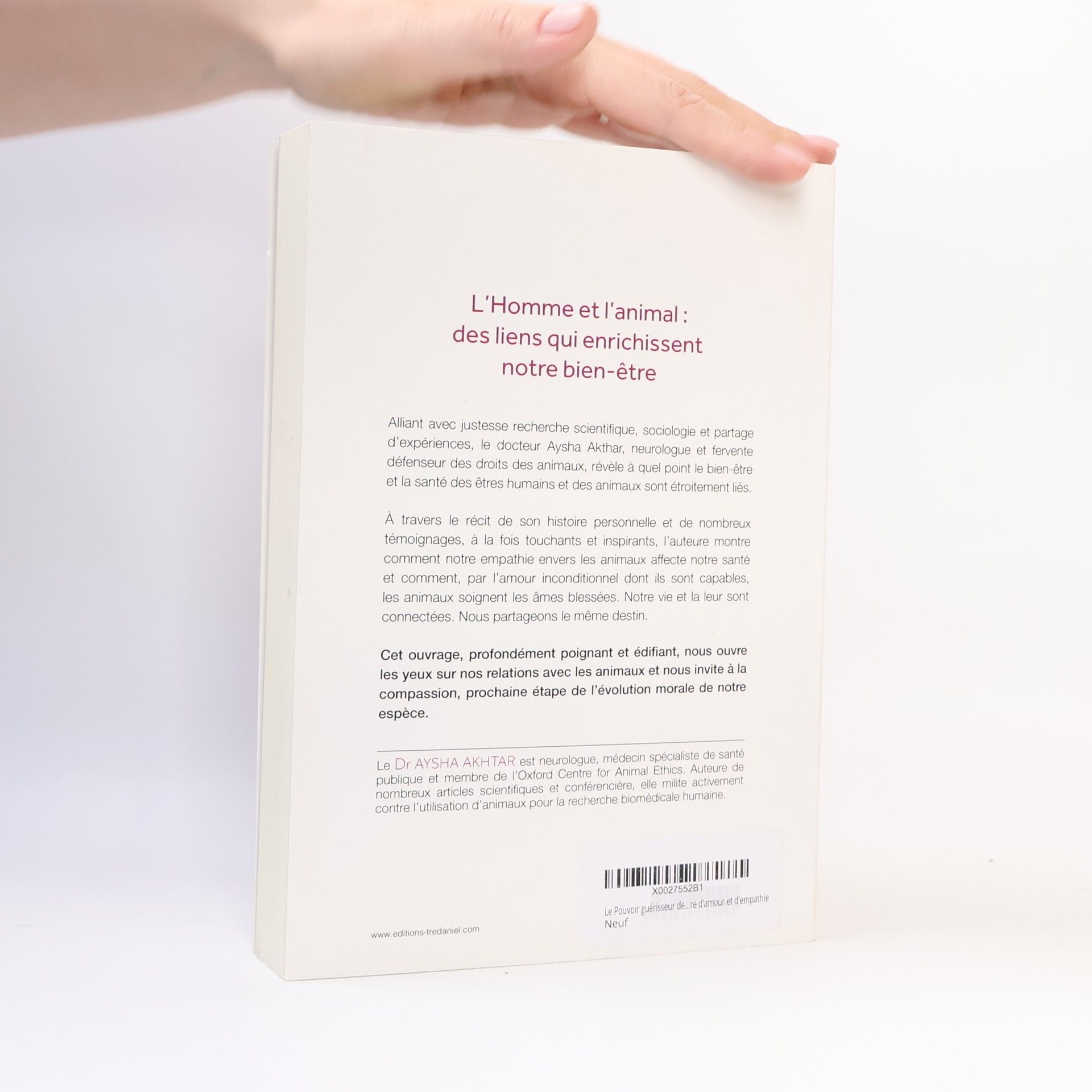 Alliant avec justesse recherche scientifique, sociologie et partage d'espérience, le docteur Aysha Akhtar, neurologue et fervente défenseur des droits des animaux, révèle à quel point le bien-être et la santé des êtres humains et des animaux sont étroitement liés.À travers le récit de son histoire personnelle et de nombreux témoignages, à la fois touchants et inspirants, l'auteure montre comment notre empathie envers les animaux affecte notre santé et comment, par l'amour inconditionnel dont ils sont capables, les animaux soignent les âmes blessées. Notre vie et la leur sont connectées. Nous partageons le même destin.