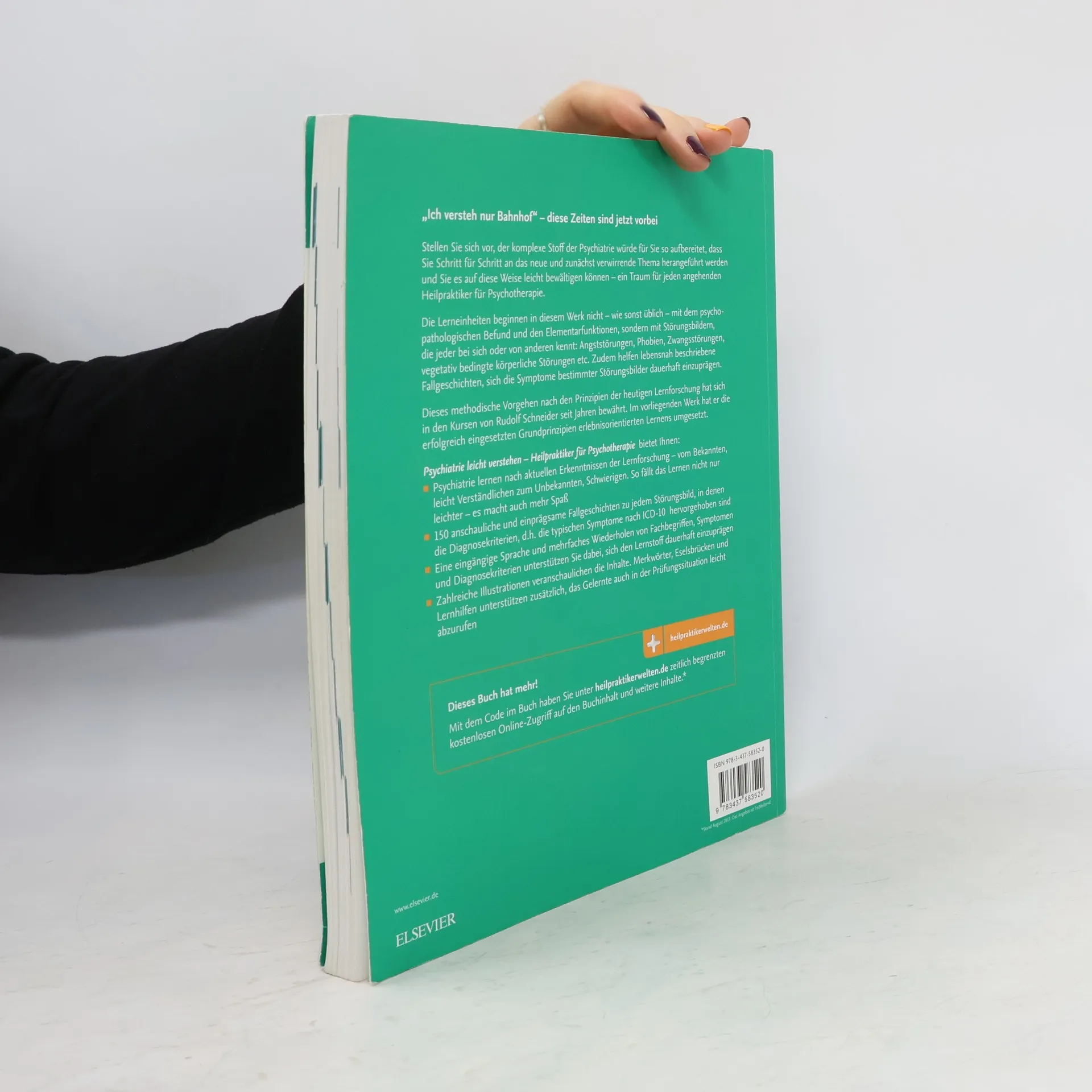 Vom leicht Verständlichen/Bekannten zum Schwierigen/Unbekannten …nach diesem, der heutigen Lernforschung entsprechenden Konzept ist Psychiatrie leicht verstehen - Heilpraktiker für Psychotherapie aufgebaut. Sie werden Schritt für Schritt an das komplexe Thema herangeführt. Abgedeckt ist die ganz Bandbreite der Psychiatrie – von Angst- und Essstörungen, über Affektive Störungen, Schizophrenie bis hin zu Grenzbereichen der Psychiatrie wie z. B. Neurologische Erkrankungen. 150 einprägsame Fallgeschichten zu jedem Krankheitsbild machen die Inhalte „lebendig„ und erleichtern das Lernen. Die typischen Symptome sind nach ICD-10 hervorgehoben. Illustrationen, Merkwörter und Gedächtnisstützen helfen Ihnen, sich das Gelernte dauerhaft zu merken. Mit dem Kauf des Buches haben Sie zeitlich begrenzten kostenfreien Zugang* zur Online-Version des Titels auf „Elsevier-Medizinwelten“. Ihre Vorteile auf einen Blick: Optimal für unterwegs oder zum schellen Nachschlagen Mit Suchfunktion zum schnellen Finden der richtigen Textstellen Mit zahlreichen zeitsparenden Features und Zusatzinhalten *Angebot freibleibend