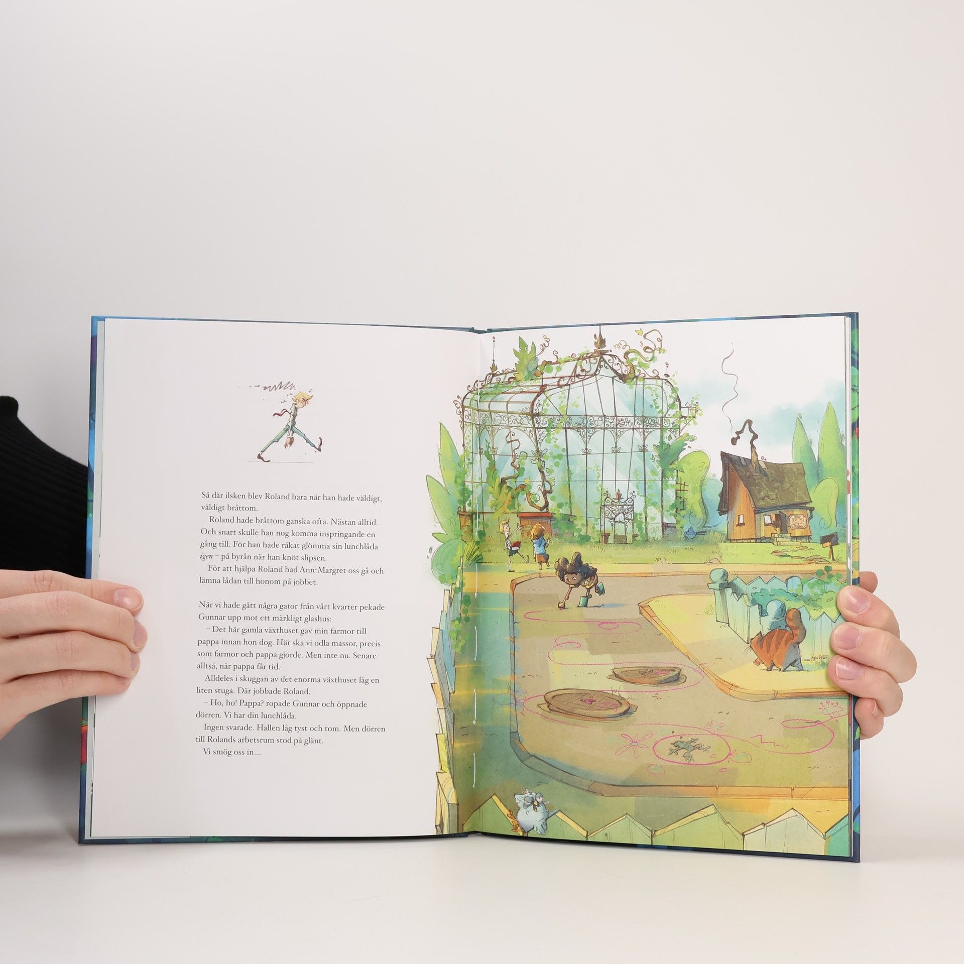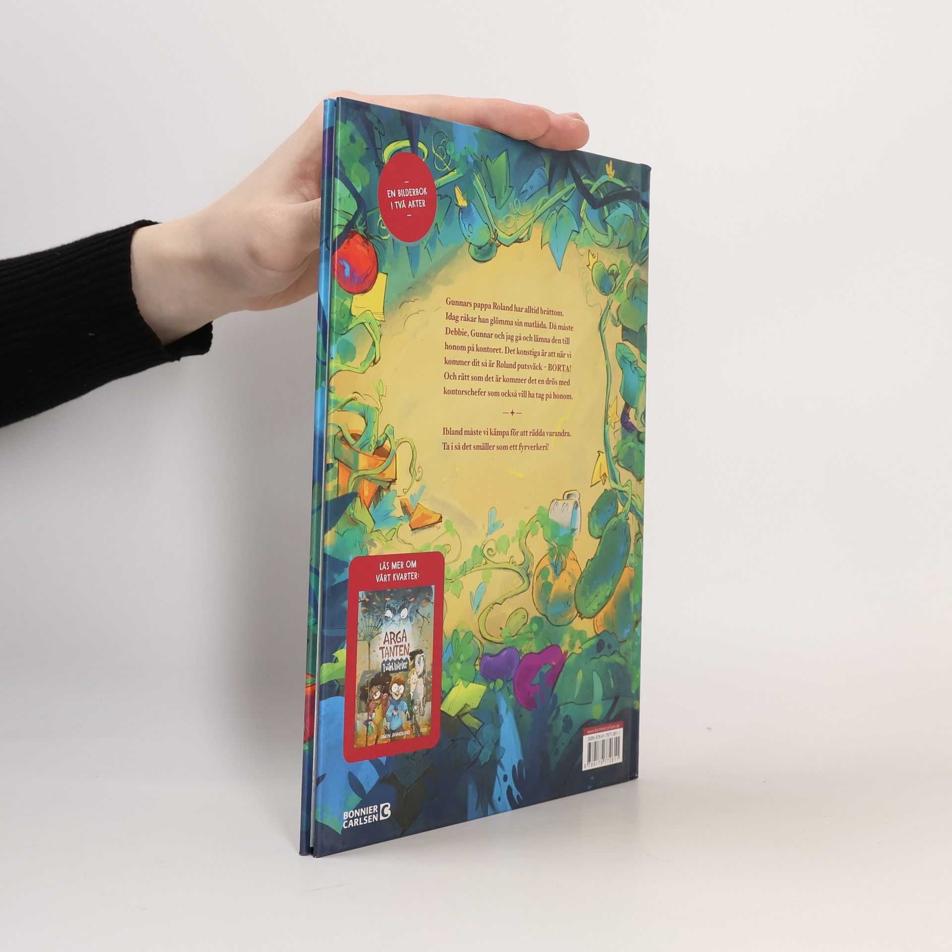 De tre vännerna Karl-Johan, Debbie och Gunnar bor med sina familjer i samma kvarter.Gunnar har en mycket effektiv pappa, Roland, som alltid har bråttom och inte hinner med sin son. En dag när pappan i sin dagliga hets glömt matlådan hemma måste Gunnar och hans två vänner gå till kontoret för att lämna över den.Men när de knackar på dörren till arbetsplatsen - och ÄNTLIGEN får se det spännande kontoret- är pappa Roland inte där. Han är puts väck! Och det hörs märkliga snyftningar från det gamla övergivna växthuset intill...Simon Jannerland har skapat ett galet och fartfyllt bildäventyr (men med en allvarlig och medmänskligt ton i grunden) om en pappa som går in i väggen. Eller rättare sagt gräver ner sig.De tre vännerna inser att de måste göra en insats, de ska till varje pris rädda Gunnars pappa från cheferna som jagar honom.I ett grönsakskrig, med grönsaker som vapen, kämpar de för att segra över pappa Rolands krävande chefer - men också över hans plikttrogna själ.En bilderbok med generöst med text och bild.Läs också: Arga tanten i vårt kvarter.
