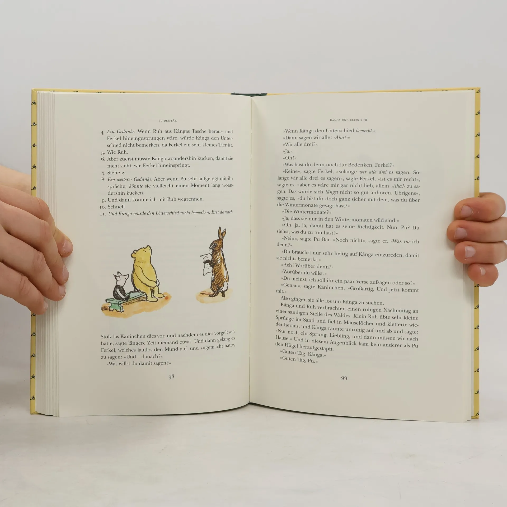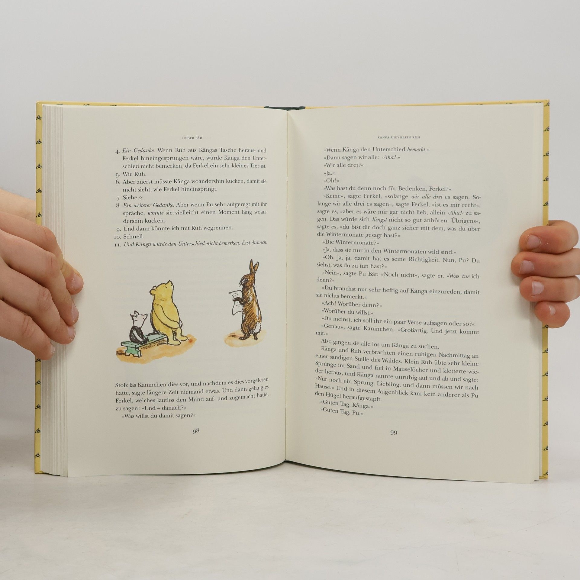 "Nach kurzer Zeit waren alle oben im Wald versammelt, und die Expotition fing an. Zuerst kamen Christopher Robin und Kaninchen, dann Ferkel und Pu; dann Känga mit Ruh in ihrem Beutel und Eule; dann I-Ah; dann, zum Schluss, Kaninchens sämtliche Bekannten-und-Verwandten." Wenn man wie Pu und seine Freunde aus dem Hundertsechzig-Morgen-Wald den "Nordpohl" entdecken will, ist es ratsam, dass zumindest einer ganz genau weiß, wie so ein Pohl aussieht. Da ist es gut, dass es Christopher Robin gibt. Der weiß dann auch, was zu tun ist, als Ferkel ein Heffalump trifft oder I-Ah seinen Schwanz verliert. Harry Rowohlts meisterhafte Übersetzung fängt den ganz besonderen Zauber dieser Geschichten auch in der deutschen Ausgabe ein.