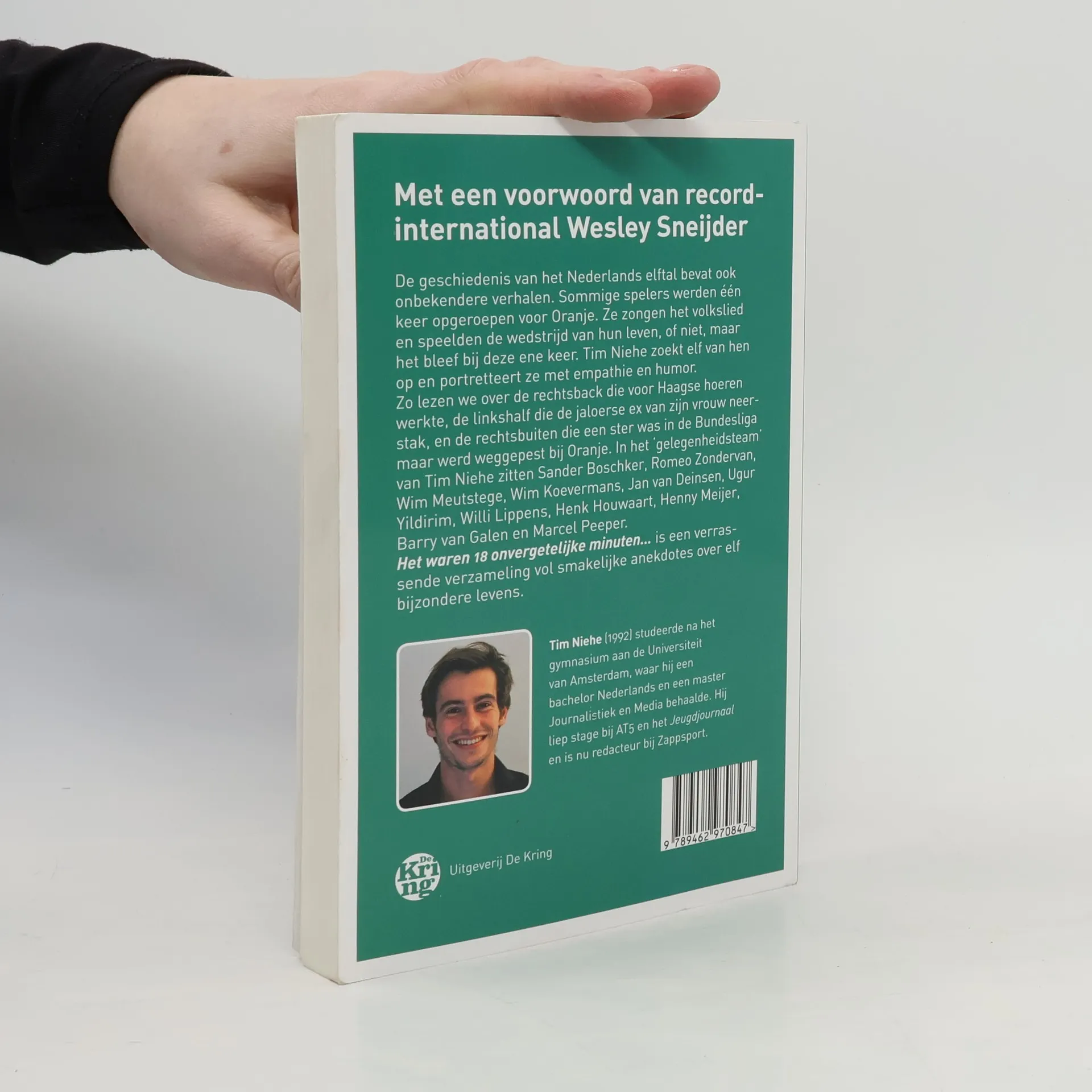 De bijzondere levensverhalen van elf spelers die één keer Oranje haaldenMet voorwoord van Wesley SneijderDe geschiedenis van het Nederlands elftal bevat ook wat onbekendere verhalen. Sommige spelers werden één keer opgeroepen voor Oranje. Ze zongen het volkslied en speelden de wedstrijd van hun leven, of niet, maar het bleef bij deze ene keer. Tim Niehe zoekt elf van hen op en portretteert ze met empathie en humor. Zo lezen we over de rechtsback die voor Haagse hoeren werkte, de linkshalf die de jaloerse ex van zijn vrouw neerstak, en de rechtsbuiten die een ster was in de Bundesliga maar werd weggepest bij Oranje. In het ‘gelegenheidsteam’ van Tim Niehe zitten Sander Boschker, Romeo Zondervan, Wim Meutstege, Wim Koevermans, Jan van Deinsen, Ugur Yildirim, Willi Lippens, Henk Houwaart, Henny Meijer, Barry van Galen en Marcel Peeper.Het waren 18 onvergetelijke minuten… is een verrassende verzameling vol smakelijke anekdotes over elf bijzondere levens.