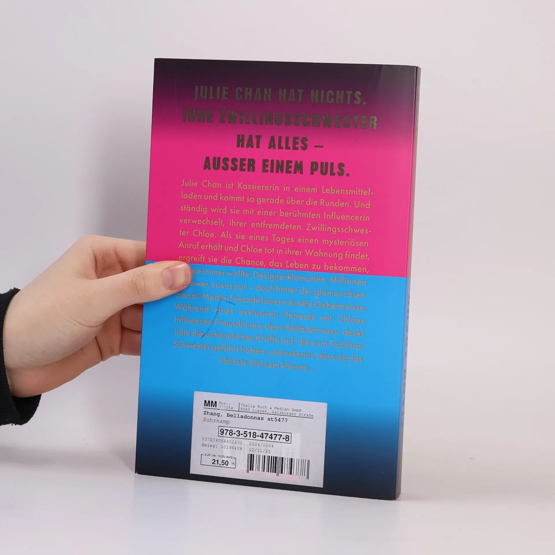 Als ihre Eltern bei einem Autounfall ums Leben kommen, werden die Zwillingsschwestern Julie und Chloe Chen als kleine Mädchen adoptiert: Während Julie in ärmlichen Verhältnissen bei ihrer geizigen Tante in einem kanadischen Provinznest aufwächst, wird Chloe von den megareichen VanHuusens in New York aufgezogen und macht eine unfassbare Karriere als Influencerin. Doch dann stirbt Chloe unter mysteriösen Umständen, und Julie erkennt, dass sie als Chloe durchgehen kann, was ihr Zugang zu einer glitzernden Welt der Sponsoren und zu einem Lebensstil verschafft, wie sie es sich nie hätte träumen lassen. Mit der Zeit wirft Julie alle moralischen Skrupel über Bord – und wird schließlich als Chloe in einen exklusiven Club der Top-notch-Influencerinnen aufgenommen: die »Belladonnas«. Alle scheint perfekt, ein tolles Leben und Kohle ohne Ende. Auf einer Luxusinsel in der Adria, auf der die »Belladonnas« jedes Jahr ein seltsames Ritual vollziehen, kommen jedoch schockierende Wahrheiten ans Licht. Und Julie muss sich entscheiden – will sie Julie bleiben oder doch eher Chloe?