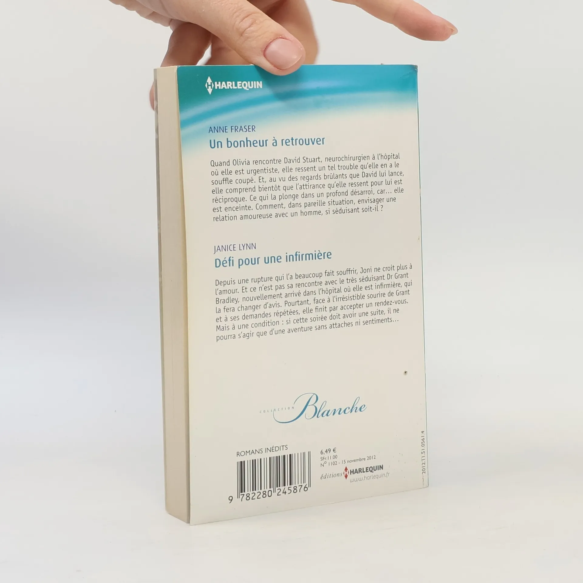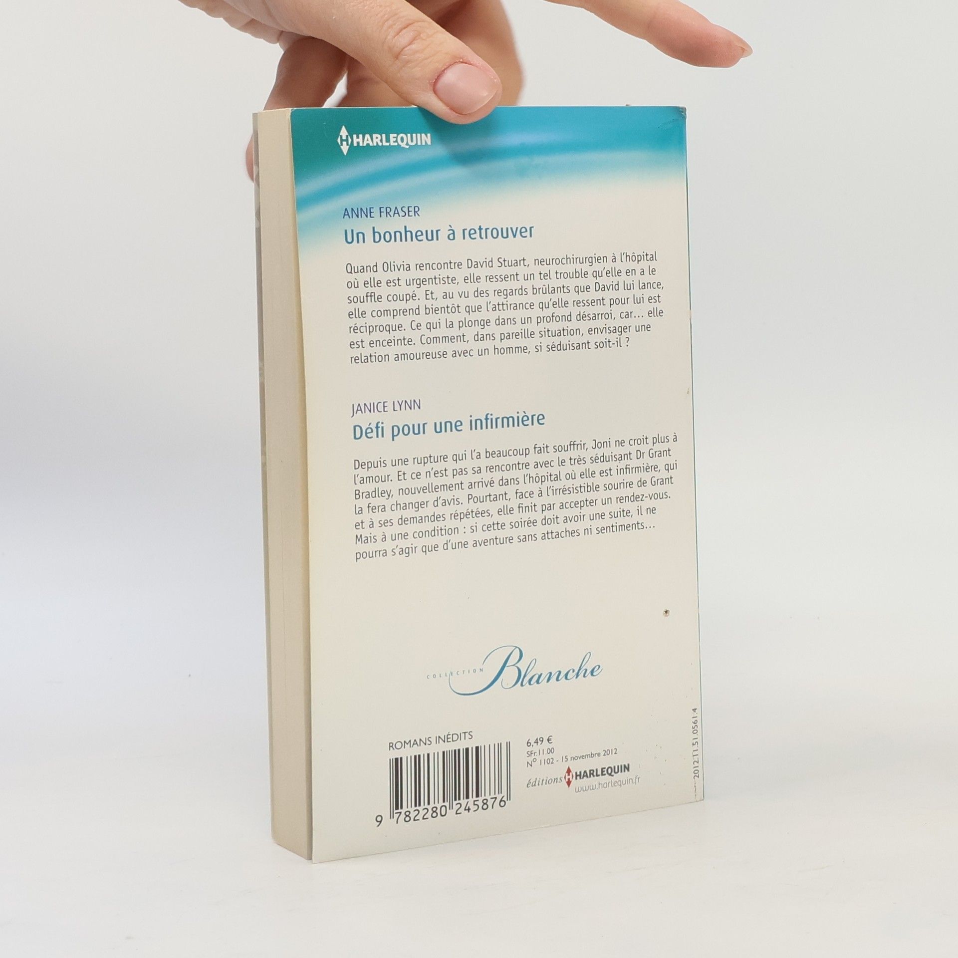 Un bonheur à retrouver, Anne Fraser : Quand Olivia rencontre David Stuart, neurochirurgien à l'hôpital où elle est urgentiste, elle en ressent un tel trouble qu'elle en a le souffle coupé. Et, au vu des regards brûlants que David lui lance, elle comprend bientôt que l'attirance qu'elle ressent pour lui est réciproque. Ce qui la plonge dans un profond désarroi, car. elle est enceinte. Comment, dans pareille situation, envisager une relation amoureuse avec un homme, si séduisant soit-il ? Défi pour une infirmière, Janice Lynn : Depuis une rupture qui l'a beaucoup fait souffrir, Joni ne croit plus à l'amour. Et ce n'est pas sa rencontre avec le très séduisant Dr Grant Bradley, nouvellement arrivé dans l'hôpital où elle est infirmière, qui la fera changer d'avis. Pourtant, face à l'irrésistible sourire de Grant et à ses demandes répétées, elle finit par accepter un rendez-vous. Mais à une condition : si cette soirée doit avoir une suite, il ne pourra s'agir que d'une aventure sans attaches ni sentiments.