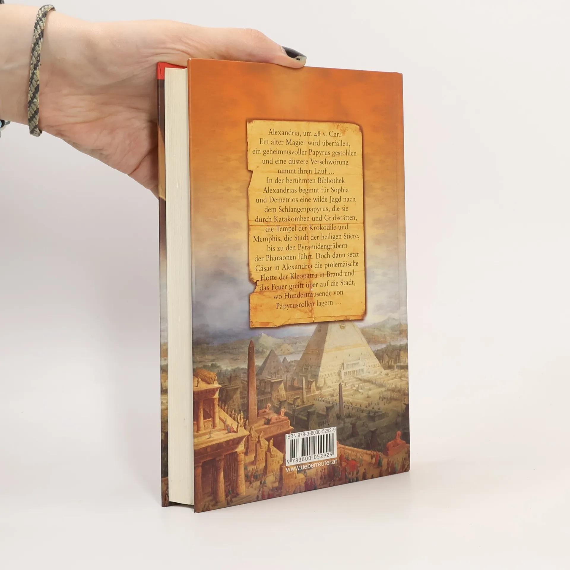 Eine stürmische Überfahrt nach Alexandria, ein geheimnisvoller Papyrus, ein Überfall in der Nacht: Die junge Sophia und Demetrios, ein Schreiber der berühmten Bibliothek, setzen alles daran, den Schlangenpapyrus wiederzufinden, der Sophias Vater gestohlen wurde. Ihre Jagd führt sie durch Katakomben und die Hallen der Krokodile bis zur Stadt des Pharaos. Doch dann bricht in Alexandria der Krieg aus. Caesar setzt die ptolemäische Flotte der Kleopatra in Brand und das Feuer greift über auf die Stadt, wo Hunderttausende von Papyrusrollen lagern.