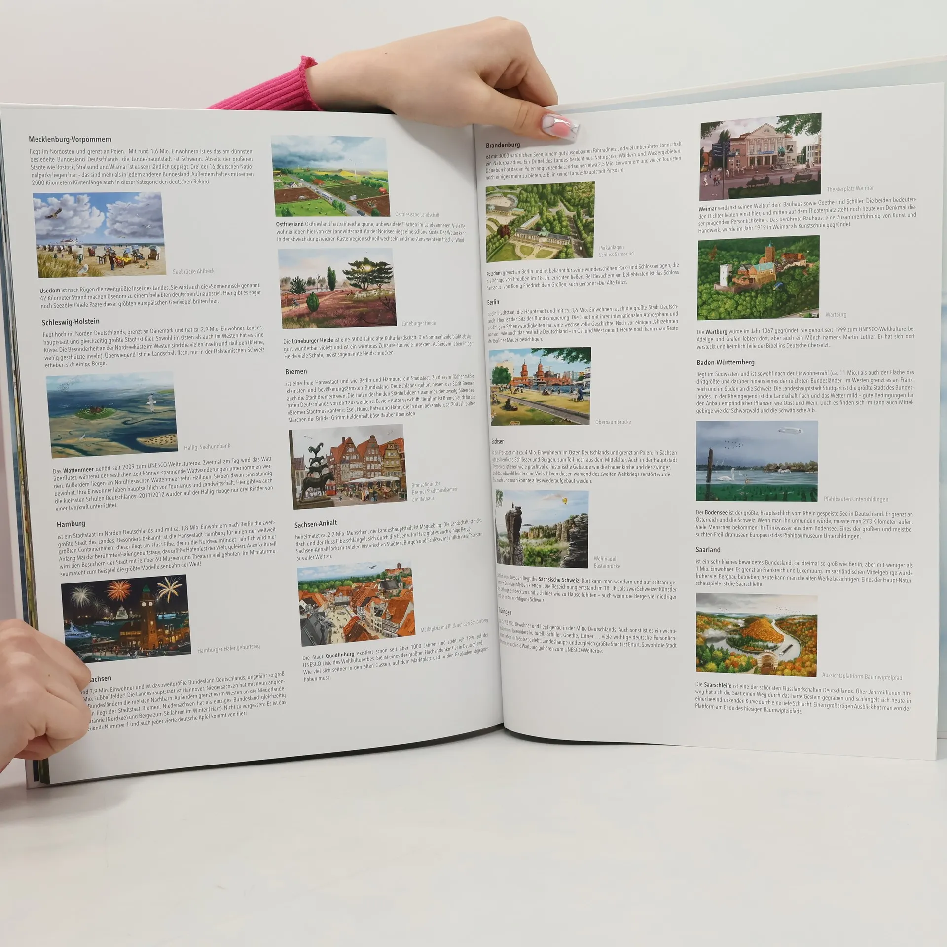 Ein Bildband, der die Schönheit Deutschlands aufzeigt und uns an wunderbare Plätze entführt - mit viel zum Entdecken! Ein großes Land, ein weites Land, ein enges Land - das Land, in dem wir leben. Dieses Bilderbuch nimmt uns mit auf eine Entdeckungsreise von Nord nach Süd, vom Meer zu den Bergen und vom Frühling in den Winter. Es fängt an Orten unserer Vergangenheit, der Gegenwart, schönen Plätzen und alltäglichen den Atem Deutschlands ein. Zugleich zeigt es, wie bunt Deutschland ist und welche Vielfalt es gibt, Vielfalt an Städten, Landschaften und Menschen. Jeder von uns kann sich in diesem Buch wiederfinden. Deutschland ist bunt! Dieses großformatige Bilderbuch fordert seine kleinen und großen Leser dazu auf, die kleine Meise auf ihrer Reise durch ihre Heimat zu begleiten, mit den Augen durch Deutschland zu reisen, mit dem Finger darin „herumzuspazieren“ und dabei all die Details zu entdecken, die Verena Körting in ihren wundervollen, detailreichen und atmosphärischen Illustrationen eingefangen hat. Ein Coffeetablebook, das den Atem Deutschlands einfängt und die Vielfalt in Bildern von Landschaften, Städten uvm. aufzeigt. Am Ende des Buches finden sich noch Erklärungen zu den einzelnen Bildern mit Informationen über jedes Bundesland und einige Sehenswürdigkeiten. Deutschland von Zuhause aus bereisen: mit diesem Bilderbuch kann man virtuell das ganze Land bereisen Ein atmosphärisches Bilderbuch: Ausdrucksstarke und detailreiche Bilder fangen den Atem Deutschlands ein, ohne dabei zu romantisieren. So vielfältig wie das Leben: Das Bilderbuch zeigt die Realität und den Alltag in Städten und Landschaften auf. Hochwertig ausgestattet: Das große Format und besonders wertiges Papier sowie die Prägung auf dem Cover machen das Buch zu einem besonderen Geschenk oder Liebhaber-Schatz fürs Kinderzimmer oder Bücherregal