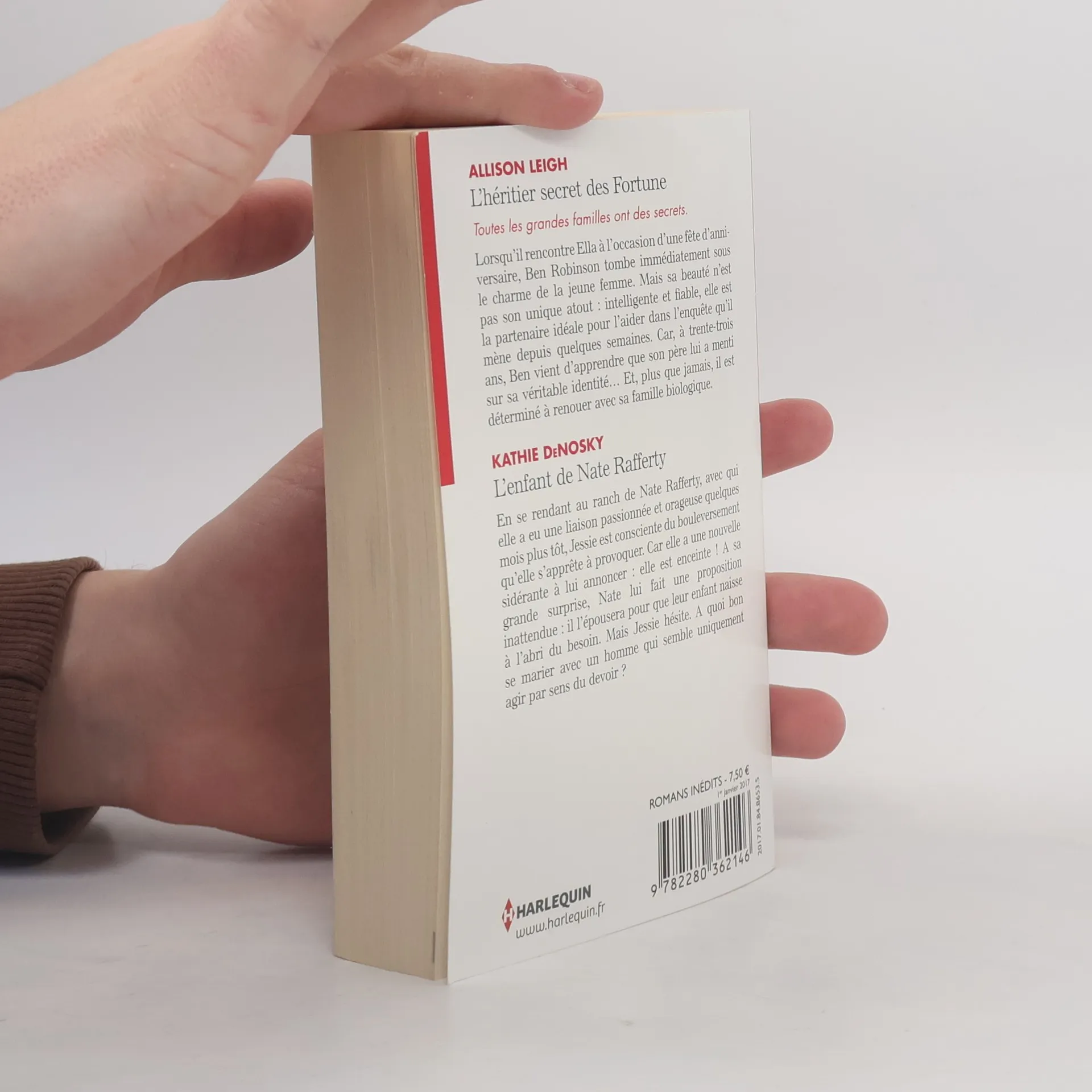 L'heritier secret des Fortune, Allison Leigh Les secrets des Fortune TOME 1 Toutes les grandes familles ont des secrets. Lorsqu'il rencontre Ella a l'occasion d'une fete d'anniversaire, Ben Robinson tombe immediatement sous le charme de la jeune femme. Mais sa beaute n'est pas son unique atout: intelligente et fiable, elle est la partenaire ideale pour l'aider dans l'enquete qu'il mene depuis quelques semaines. Car, a trente-trois ans, Ben vient d'apprendre que son pere lui a menti sur sa veritable identite... Et, plus que jamais, il est determine a renouer avec sa famille biologique. L'enfant de Nate Rafferty, Kathie DeNosky En se rendant au ranch de Nate Rafferty, avec qui elle a eu une liaison passionnee et orageuse quelques mois plus tot, Jessie est consciente du bouleversement qu'elle s'apprete a provoquer. Car elle a une nouvelle siderante a lui annoncer: elle est enceinte ! A sa grande surprise, Nate lui fait une proposition inattendue: il l'epousera pour que leur enfant naisse a l'abri du besoin. Mais Jessie hesite. A quoi bon se marier avec un homme qui semble uniquement agir par sens du devoir ?