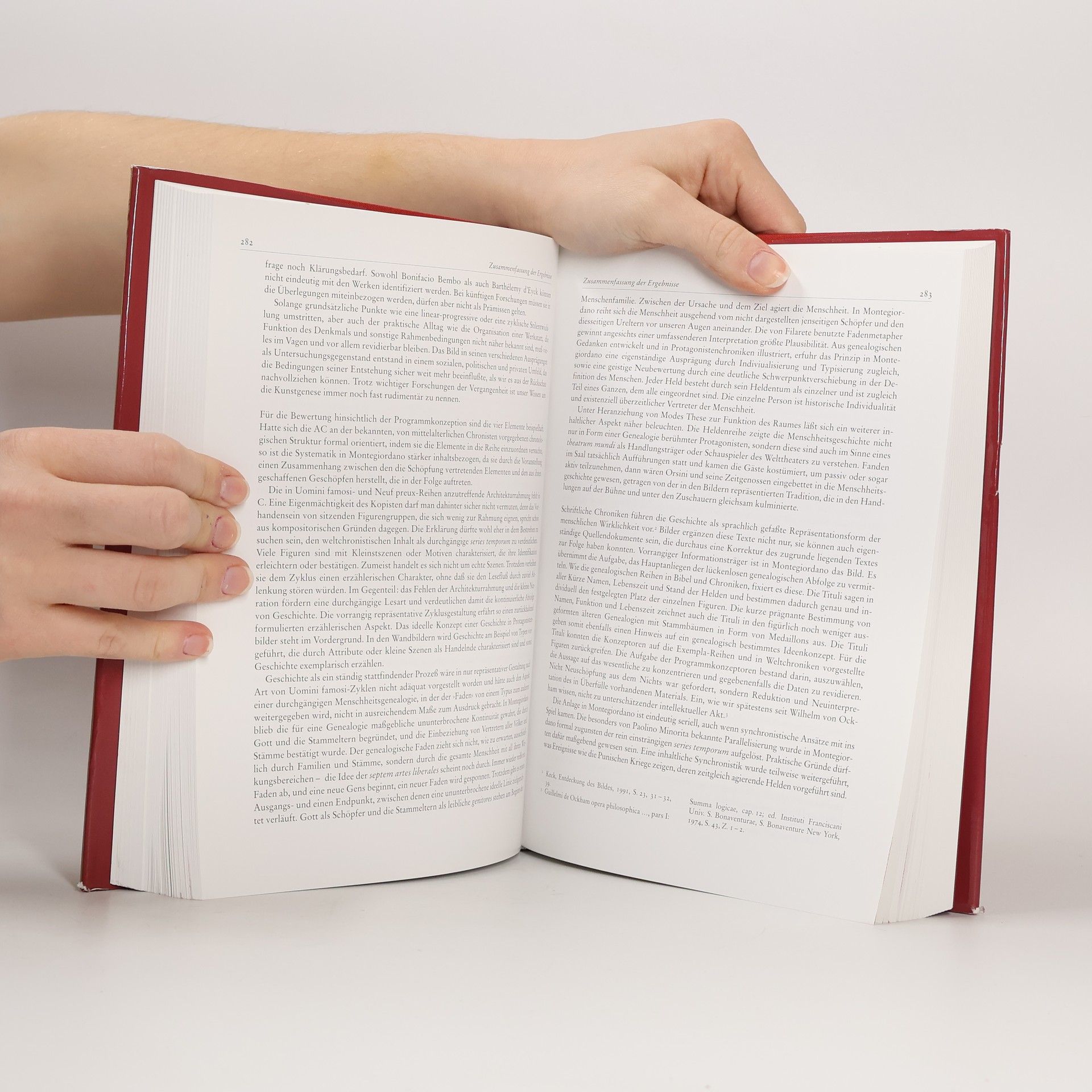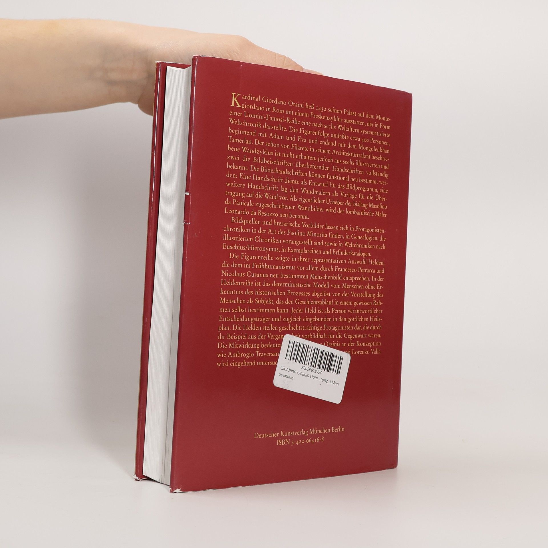 Kardinal Giordano Orsini ließ 1432 seinen Palast auf dem Montegiordano in Rom mit einem Freskenzyklus ausstatten, der in Form einer Uomini-Famosi-Reihe eine nach sechs Weltaltern systematisierte Weltchronik darstellte. Die Figurenfolge umfaßte etwa 400 Personen, beginnend mit Adam und Eva und endend mit dem Mongolenkhan Tamerlan. Der schon von Filarete in seinem Architekturtraktat beschriebene Wandzyklus ist nicht erhalten, jedoch aus sechs illustrierten und zwei, die Bildbeischriften überliefernden, Handschriften vollständig bekannt. Die Bilderhandschriften können funktional neu bestimmt Eine Handschrift diente als Entwurf für das Bildprogramm, eine weitere Handschrift lag den Wandmalern als Vorlage für die Übertragung auf die Wand vor. Bildquellen und literarische Vorbilder lassen sich in Protagonistenchroniken in der Art des Paolino Minorita, in illustrierten Chroniken vorangestellten Genealogien finden sowie in Weltchroniken nach Eusebius Hieronymus, in Exemplareihen und Erfinderkatalogen. Die Figurenreihe zeigte in ihrer repräsentativen Auswahl Helden, die dem im Frühhumanismus vor allem durch Francesco Petrarca und Nicolaus Cusanus neu bestimmten Menschenbild entsprechen.