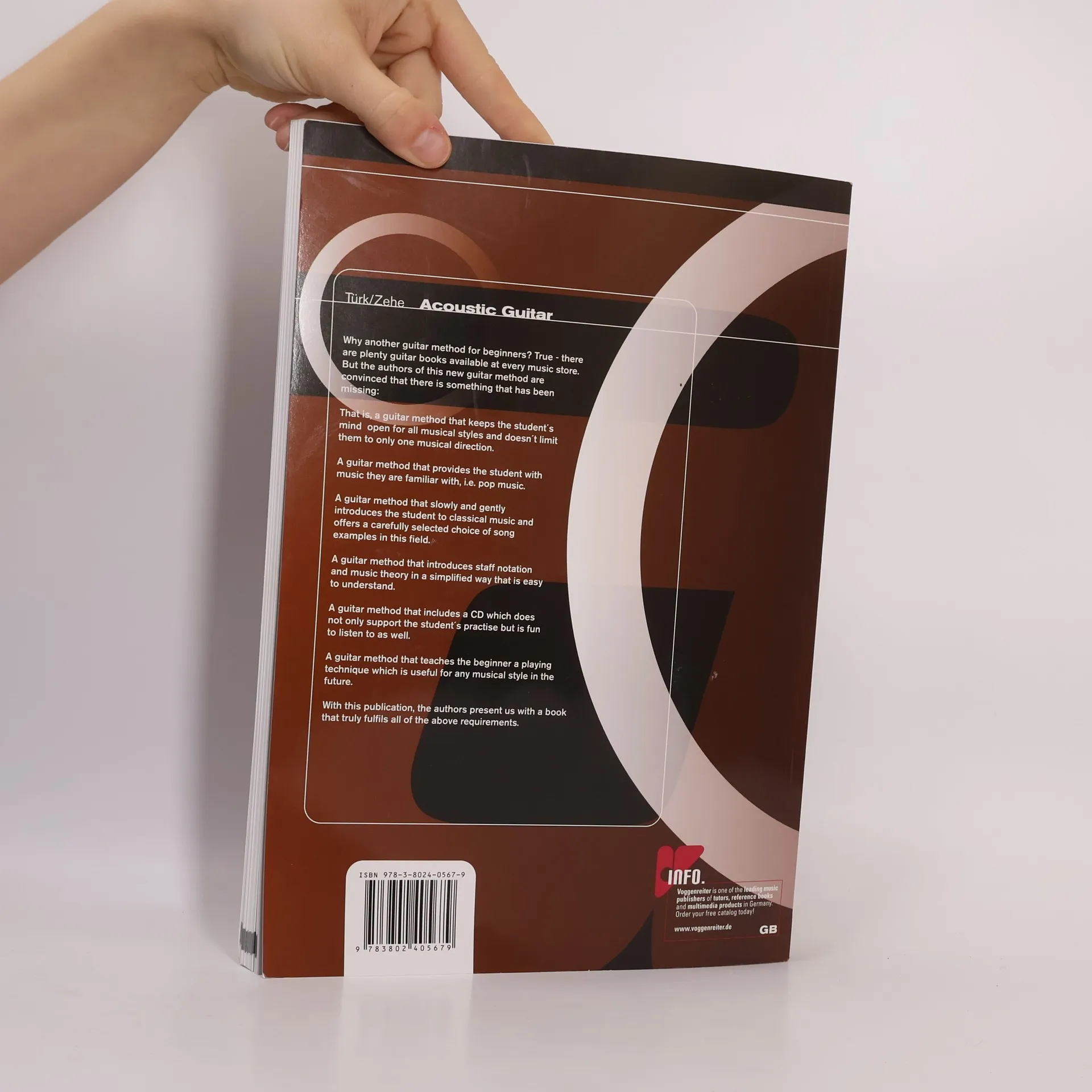 A New Way to learn the guitar for lessons and self-studies. This method keeps the student's mind open for all musical styles and doesn't limit them to only one musical direction. Provides the student with music they are familiar with i.e. pop music. Slowly and gently introduces the student to classical music and offers a carefully selected choice of song examples in this field. Introduces staff notation and music theory in a simplified way that is easy to understand. Includes a CD which does not only support the student's practice but is fun to listen to as well. The beginner is taught a playing technique which is useful for any musical style in the future.