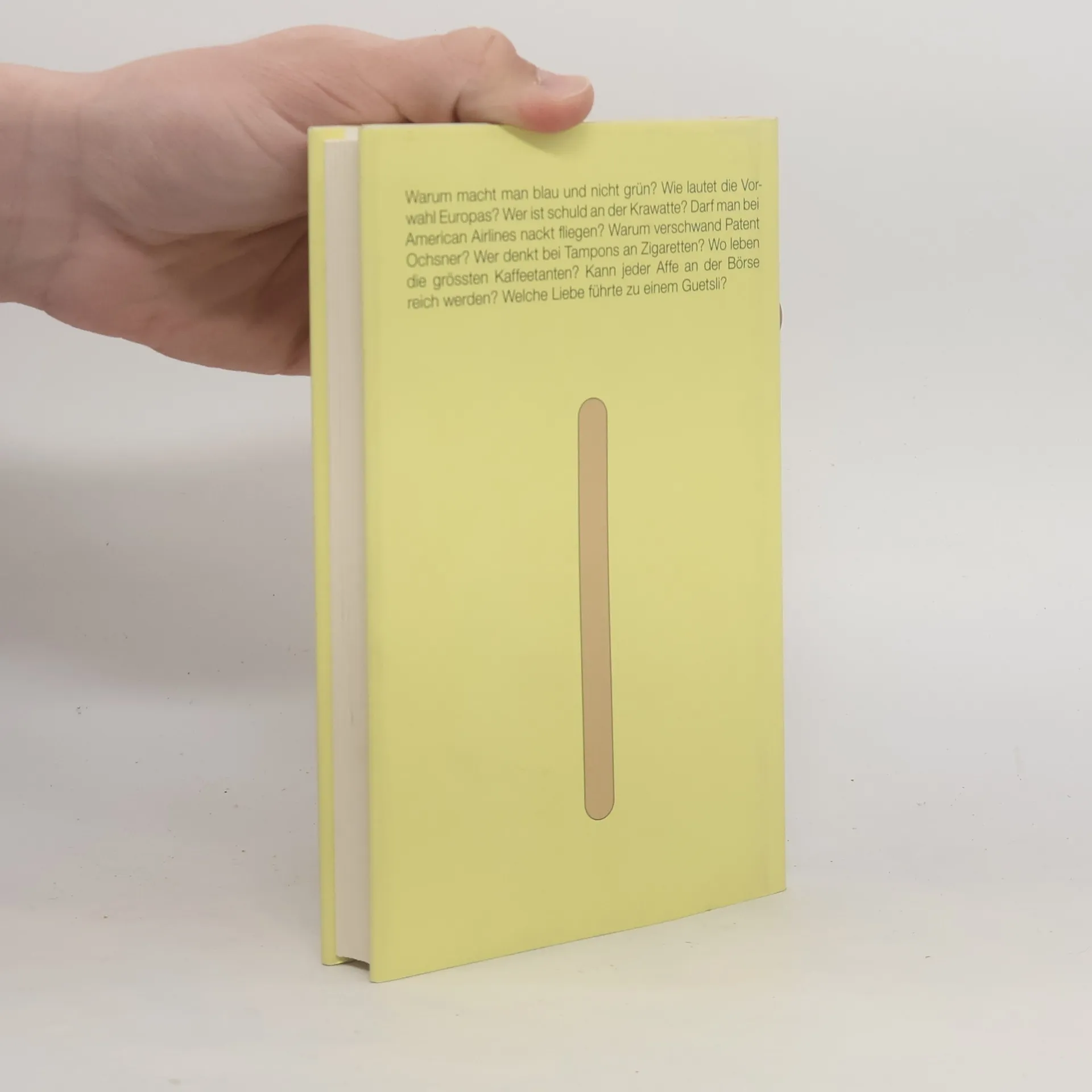 Warum macht man blau und nicht grün? Wie lautet die Vorwahl Europas? Wer ist schuld an der Krawatte? Darf man bei American Airlines nackt fliegen? Warum verschwand Patent Ochsner? Wer denkt bei Tampons an Zigaretten? Wo leben die grössten Kaffeetanten? Kann jeder Affe an der Börse reich werden? Welche Liebe führte zu einem Guetsli? Überspringen Sie jeweils den Wirtschaftsteil Ihrer Zeitung? Das sollten Sie beim „Tages-Anzeiger“ nicht tun: Jeden Tag erscheint in dieser Zeitung auf der ersten Wirtschaftsseite „Die Frage“. Kurz und witzig beantwortet hier ein Redaktionsteam um Eric Baumann und Stefan Eiselin Fragen aus der weiten Welt der Wirtschaft. Auf unterhaltende Art wird viel Wissen vermittelt. Wir staunen über Kurioses und Alltägliches. Und wir entdecken: Wirtschaft ist nicht nur für Fachleute. Wir alle sind Teil der Wirtschaft. Zum Beispiel dann, wenn wir Glace essen.