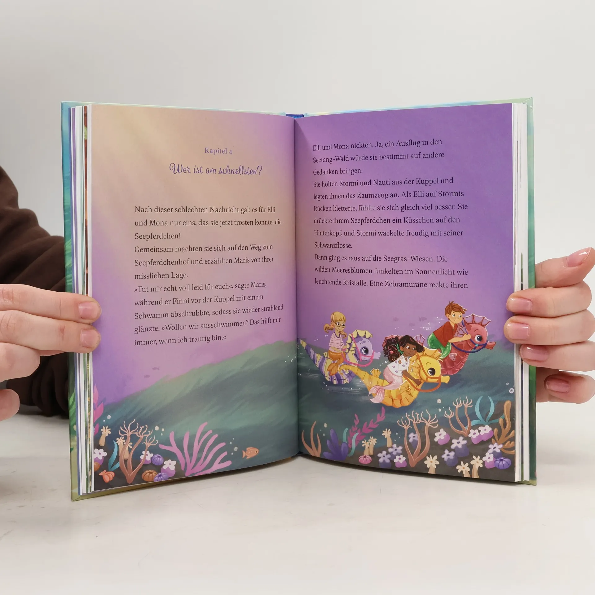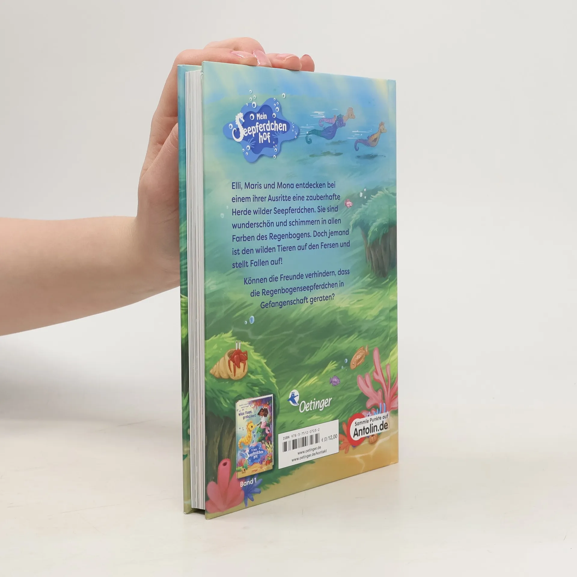 Bei einem ihrer Ausritte entdecken Elli, Maris und Mona eine zauberhafte Herde wilder Seepferdchen. Sie sind wunderschön und schimmern in allen Farben des Regenbogens. Doch jemand ist den wilden Tieren auf den Fersen. Wer steckt hinter den Fallen im Seetang-Wald? Und werden die Freunde verhindern können, dass die Regenbogen-Seepferdchen in Gefangenschaft geraten?