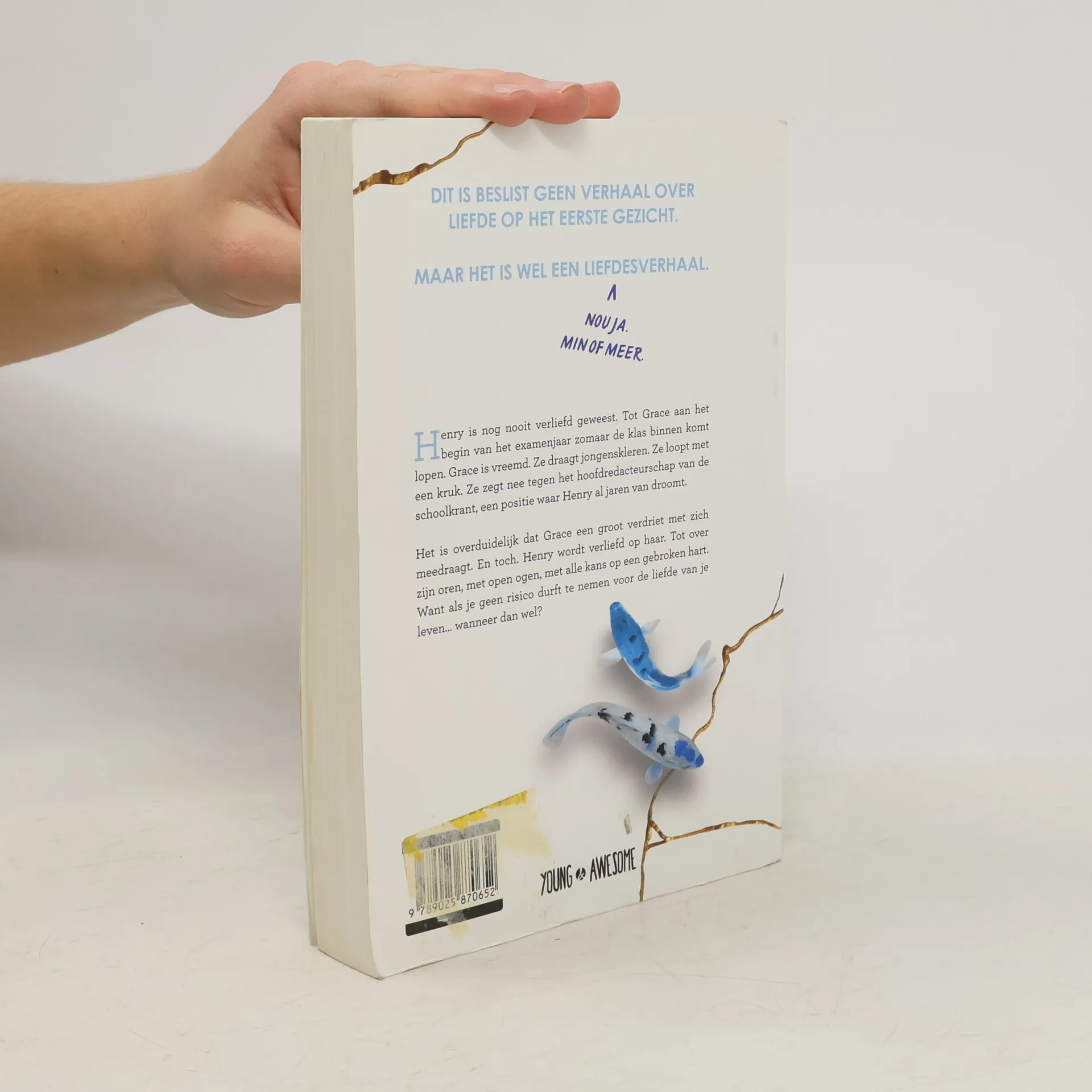Dit is absoluut geen verhaal over liefde op het eerste gezicht. Maar het is een liefdesverhaal. Nou ja… Min of meer. Henry is nooit verliefd geweest. Tot Grace aan het begin van het examenjaar bij hem op school komt. Grace is vreemd. Ze draagt jongenskleren. Ze loopt met een kruk. Ze zegt nee tegen het hoofdredacteurschap van de schoolkrant, waar Henry al jaren van droomt. Het is overduidelijk dat Grace een groot verdriet met zich meedraagt. En toch. Henry wordt verliefd op haar. Tot over zijn oren, met open ogen, met alle kans op een gebroken hart. Want als je geen risico durft te nemen voor de liefde van je leven… wanneer dan wel?