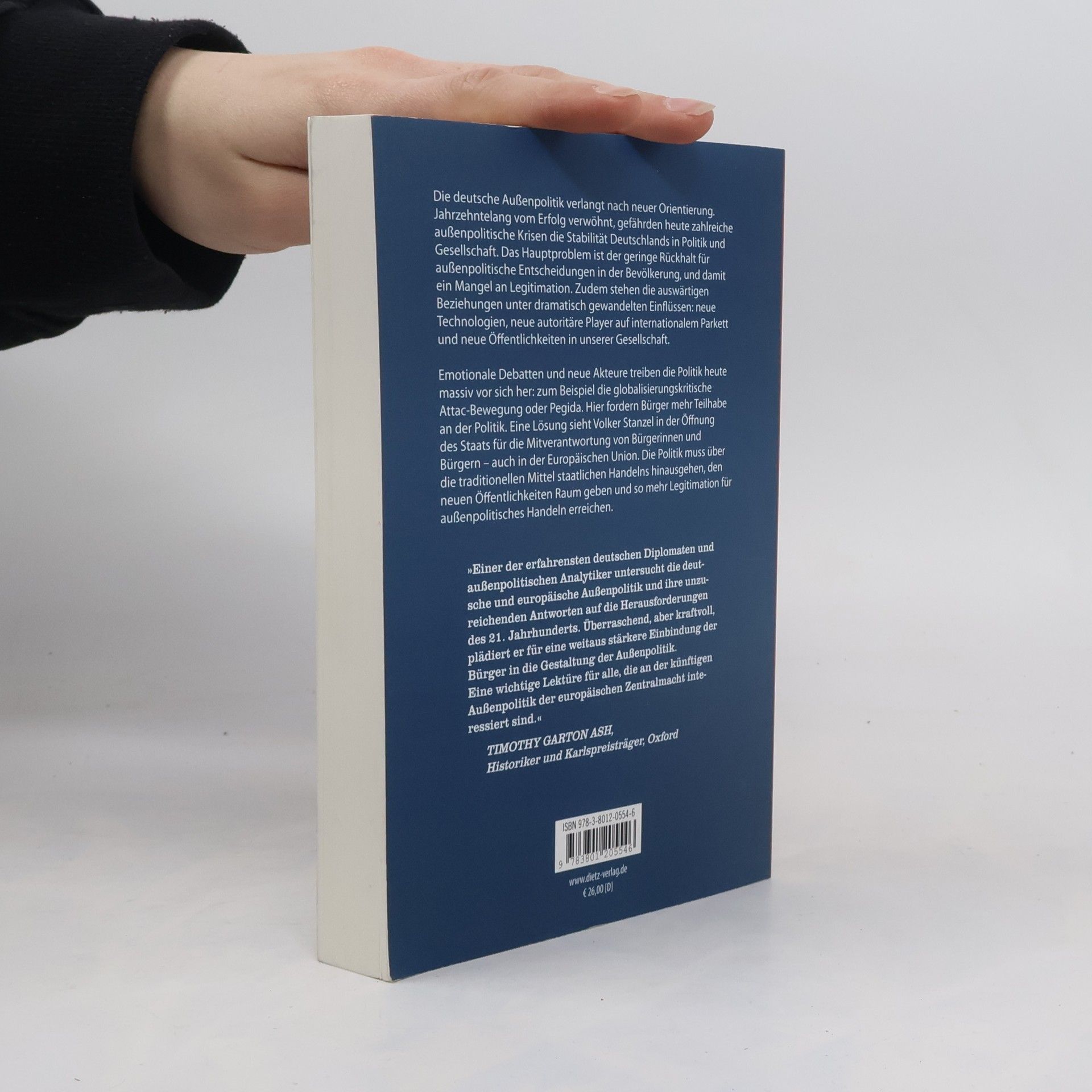 Die deutsche Außenpolitik, jahrzehntelang erfolgsverwöhnt, verlangt nach neuer Orientierung. Denn zahlreiche außenpolitische Krisen gefährden die Stabilität Deutschlands in Politik und Gesellschaft. Das Hauptproblem ist der geringe Rückhalt für außenpolitische Entscheidungen in der Bevölkerung, und damit ein Mangel an Legitimation. Zudem stehen die deutschen auswärtigen Beziehungen unter dramatisch gewandelten Einflüssen: neue Technologien, neue starke und autoritäre Player auf internationalem Parkett sowie neue Öffentlichkeiten in unserer Gesellschaft. Emotionalisierte Öffentlichkeiten treiben die Politik heute massiv vor sich her: zum Beispiel die globalisierungskritische Attac-Bewegung oder Pegida. Hier fordern Bürger mehr Teilhabe an der Politik. Eine Lösung sieht Volker Stanzel in der Öffnung des Staats für die Mitverantwortung von Bürgerinnen und Bürgern – auch in der Europäischen Union. Die Politik muss über die traditionellen Mittel staatlichen Handelns hinausgehen, die neuen Öffentlichkeiten ansprechen und so eine größere Legitimation für außenpolitisches Handeln erreichen.