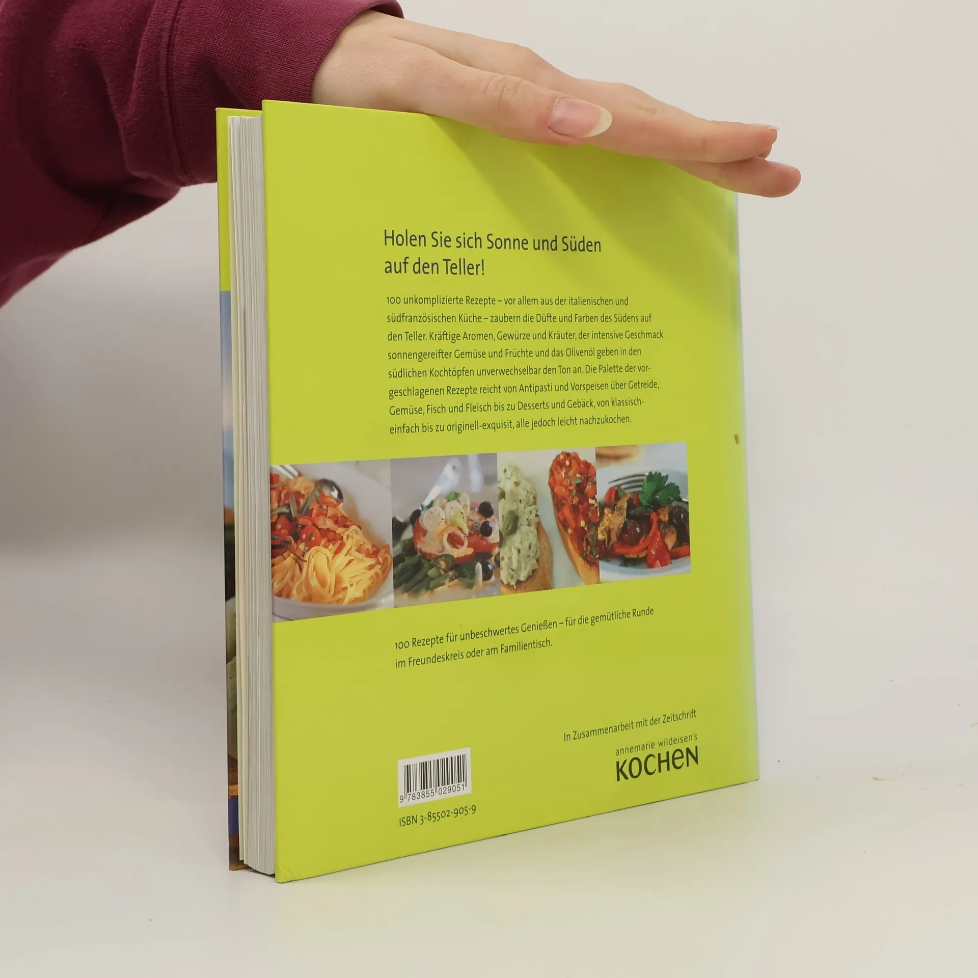 Holen Sie sich Sonne und Süden auf den Teller! 100 unkomplizierte Rezepte - vor allem aus der italienischen und südfranzösischen Küche - zaubern die Düfte und Farben des Südens auf den Teller. Kräftige Aromen, Gewürze und Kräuter, der intensive Geschmack sonnegereifter Gemüse und Früchte und das Olivenöl geben in den südlichen Kochtöpfen unverwechselbar den Ton an. Die Palette der vorgeschlagenen Rezepte reicht von Antipasti und Vorspeisen über Getreide, Gemüse, Fisch und Fleisch bis zu Desserts und Gebäck, von klassisch-einfach bis zu originell-exquisit, alle jedoch leicht nachzukochen.