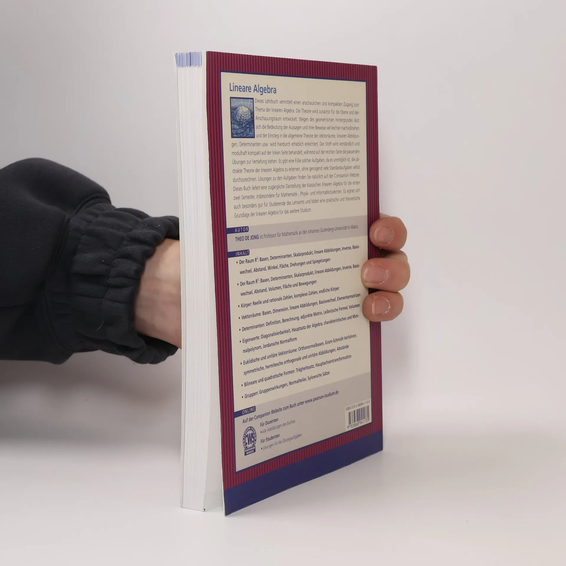 Das Lehrbuch lineare Algebra von Theo de Jong (Professor für Mathematik an der Johannes-Gutenberg Universität in Mainz) bietet einen anschaulichen Zugang zur linearen Algebra. Das Buch beinhaltet neben der Theorie eine große Anzahl an Übungsaufgaben für das Selbststudium. Mit seinem Aufbau und Inhalten richtet es sich vor allem an Studierende in den ersten Semestern.