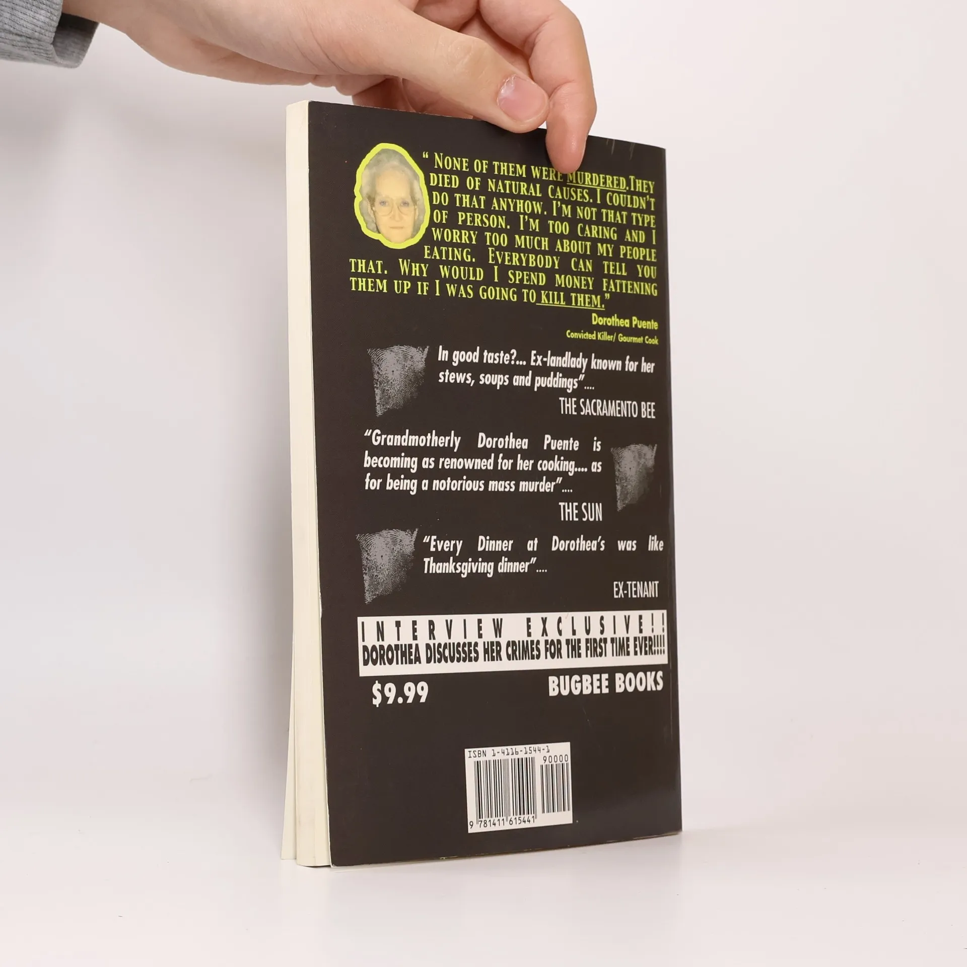 Dorothea Puente ran a boarding house for down and outs. She was tried for killing seven people by drugging them with Dalmane and alcohol. She was found guilty in three cases and one juror held out on the other four. After their deaths she continued to draw their social security cheques. Sentenced to life in prison she wrote this book. She never showed any remorse and said to prosecutors, "I don't give a shit what anyone thinks of me." Dorothea thought herself a gourmet cook and said that all the deaths were due to natural causes. She is known as one of the most prolific and evil female serial killers in America.
