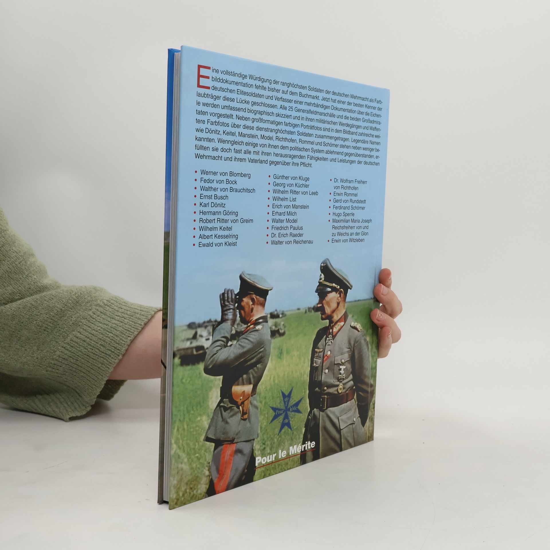 Eine vollständige Würdigung der ranghöchsten Soldaten der deutschen Wehrmacht als Farbbild-Dokumentation fehlte bisher auf dem Buchmarkt. Jetzt hat einer der besten Kenner der deutschen Elitesoldaten und Verfasser einer mehrbändigen Dokumentation über die Eichenlaubträger diese Lücke geschlossen. Alle 25 Generalfeldmarschälle und die beiden Großadmirale werden umfassend biographisch skizziert und in ihren militärischen Werdegängen und Waffentaten vorgestellt. Neben großformatigen farbigen Porträtfotos sind in diesem Bildband zahlreiche weitere Farbfotos über diese dienstranghöchsten Soldaten zusammengetragen. Legendäre Namen wie Dönitz, Keitel, Manstein, Model, Richthofen, Rommel und Schörner stehen neben weniger bekannten. Wenngleich einige von ihnen dem politischen System ablehnend gegenüberstanden, erfüllten sie doch fast alle mit ihren herausragenden Fähigkeiten und Leistungen der deutschen Wehrmacht und ihrem Vaterland gegenüber ihre Pflicht.
