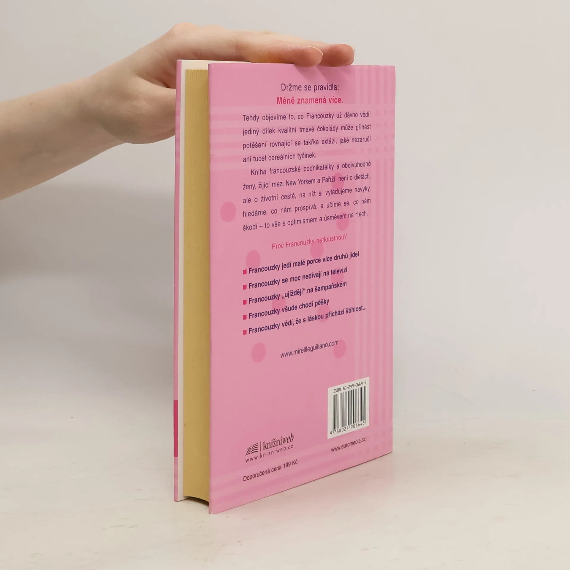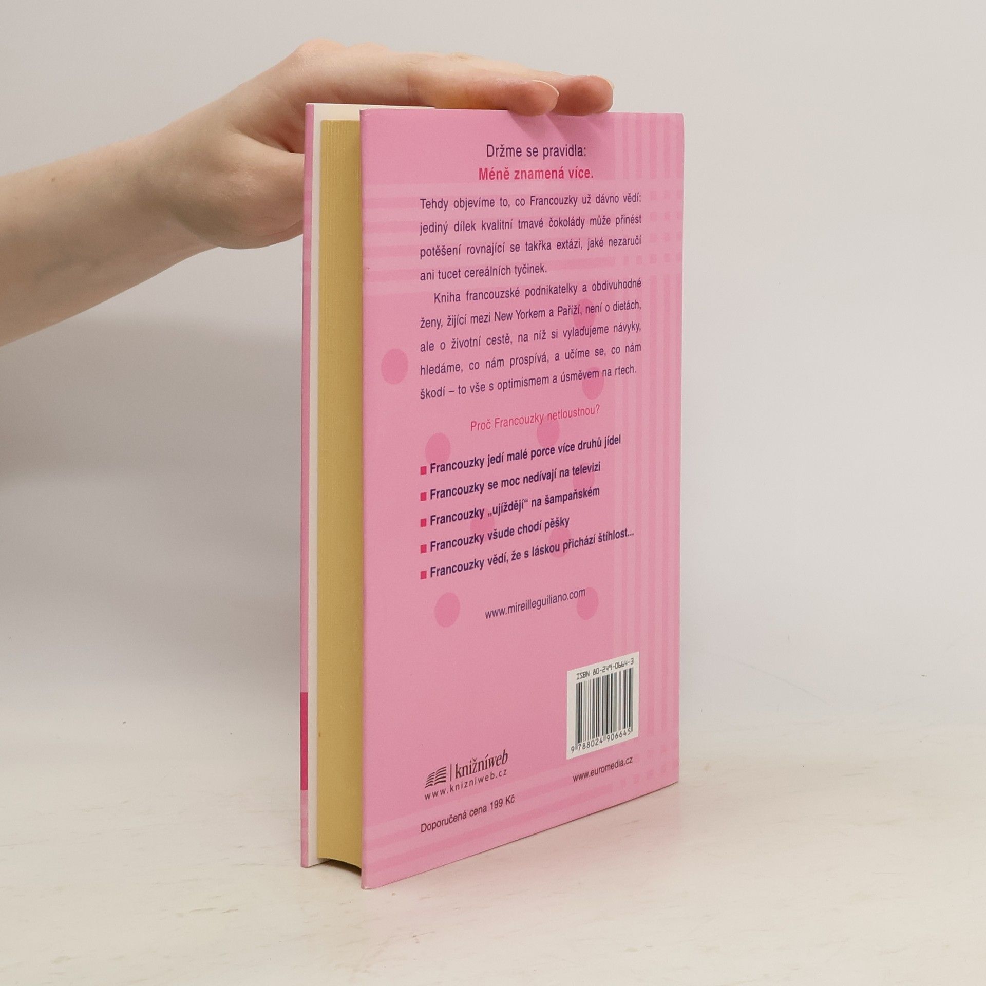 Autorka radí ženám, jak si, podle francouzského vzoru, upravit životosprávu a stravovací návyky a po celý život si udržet ideální hmotnost. Trik spočívá v tom, že nikdy nesmíte hladovět, naopak ke každému jídlu si dopřát několik chodů, ale pouze v malém množství. Občas si můžete dát i kousek svého oblíbeného vysoce kalorického jídla, ale musíte to v brzké době vykompenzovat větší zdrženlivostí. Cílovým pocitem má být uspokojení a radost z jídla, v žádném případě ne strádání. Stravovací návyky je třeba doplnit pitným režimem a pohybovou aktivitou (nikoli však týráním se v tělocvičnách). Dobrý dojem poněkud kalí poznání, že k dosažení uspokojivého výsledku musíte tento nový životní styl praktikovat už do konce života. Součástí textu jsou zajímavé recepty.