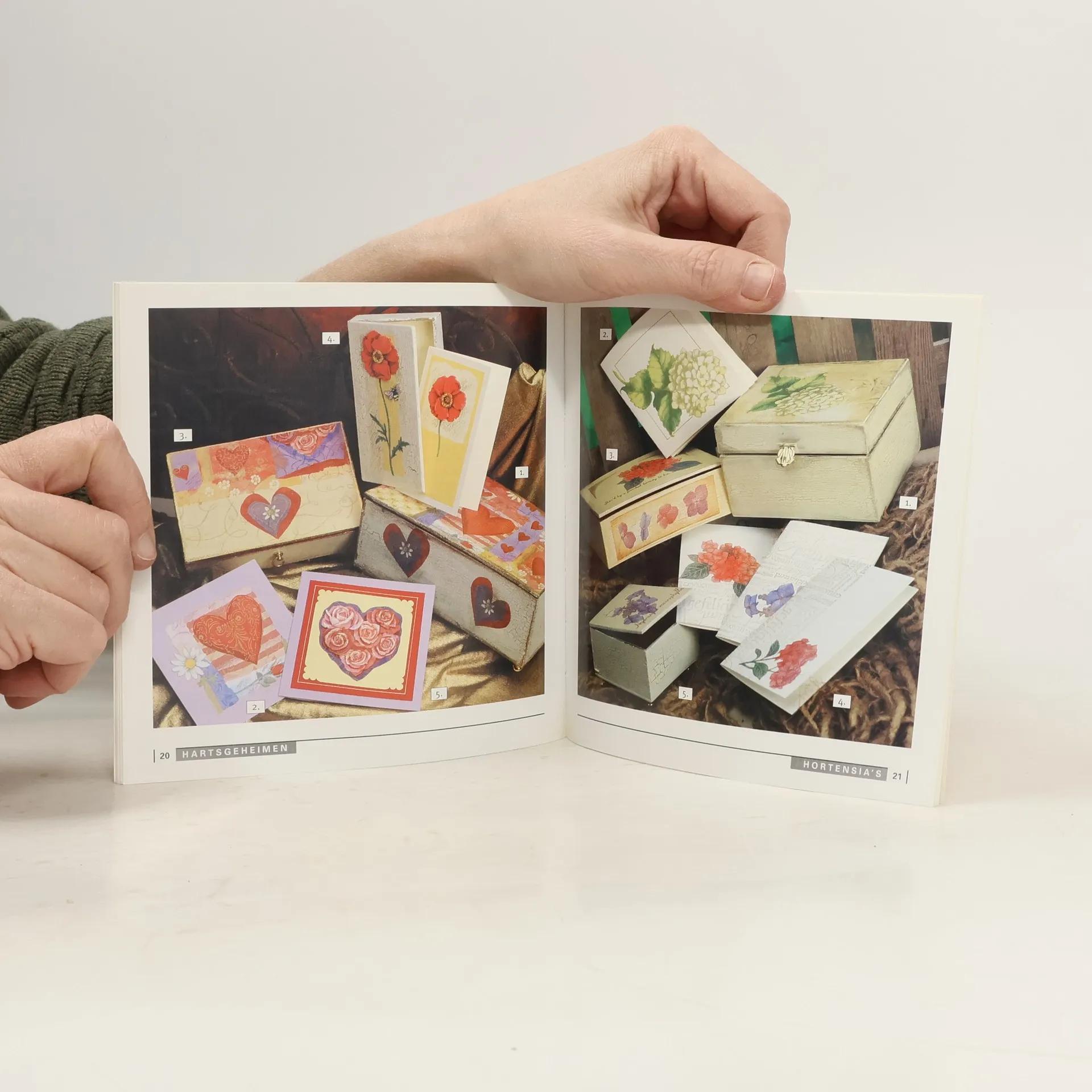 Ideeën voor het decoreren van kleine houten kistjes met uit papieren servetten geknipte motieven.