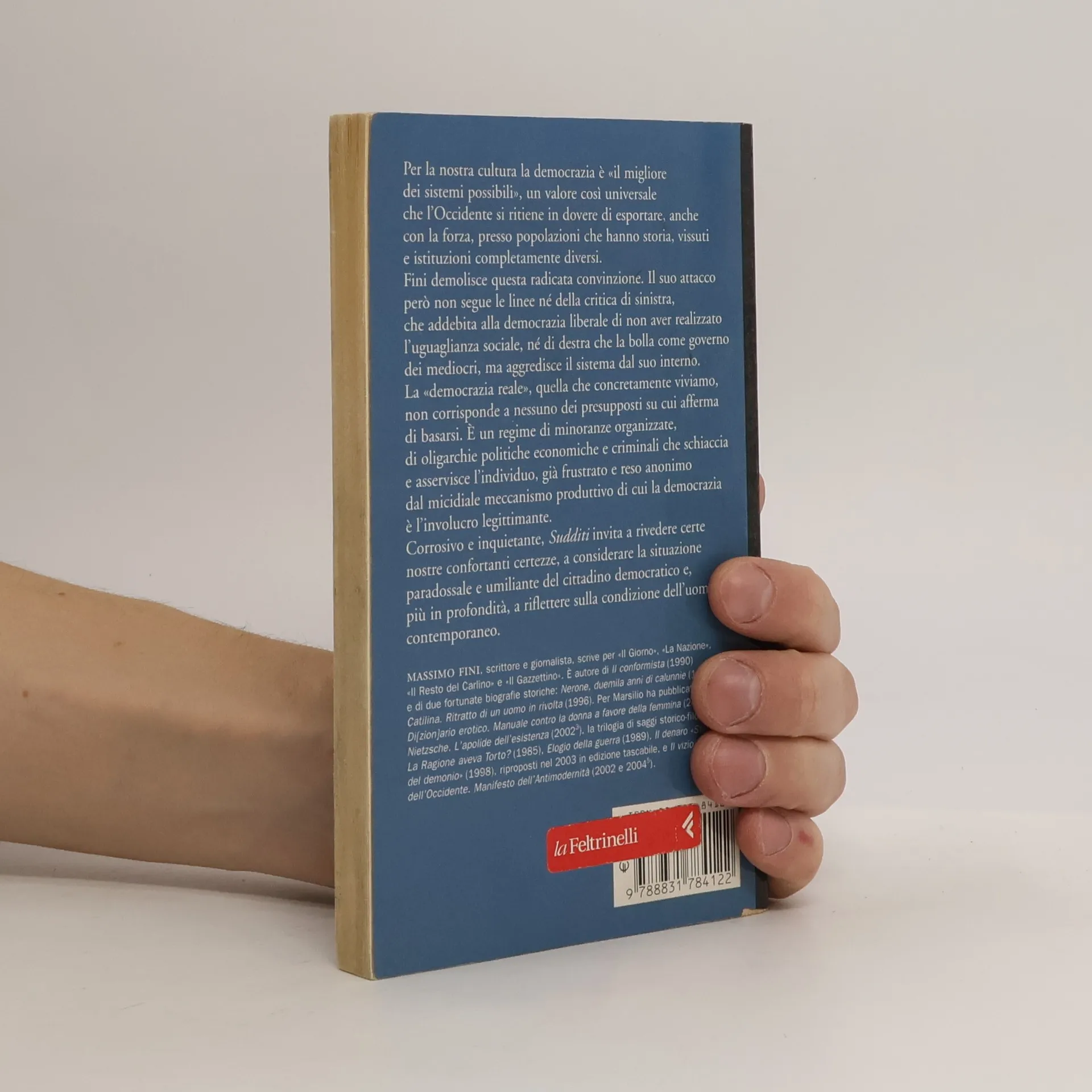Per la nostra cultura la democrazia è "il migliore dei sistemi possibili", un valore così universale che l'Occidente si ritiene in dovere di esportare, anche con la forza, presso popolazioni che hanno storia, vissuti e istituzioni completamente diversi. Fini demolisce questa radicata convinzione. Il suo attacco però non segue le linee né della critica di sinistra, che addebita alla democrazia liberale di non aver realizzato l'uguaglianza sociale, né di destra che la bolla come governo dei mediocri. La "democrazia reale" è un regime di minoranze organizzate, di oligarchie politiche economiche e criminali che schiaccia e asservisce l'individuo, già frustrato e reso anonimo dal meccanismo produttivo di cui la democrazia è l'involucro legittimante.