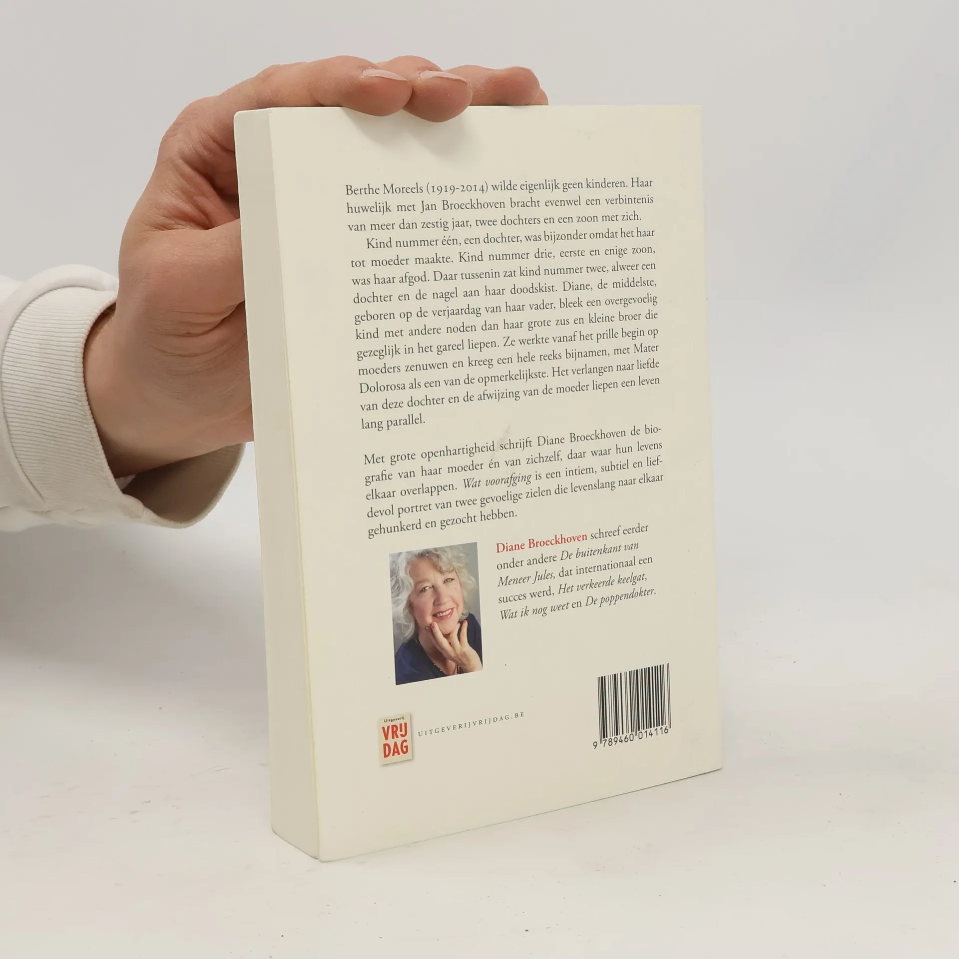 Berthe Moreels (1919-2014) wilde eigenlijk geen kinderen. Haar huwelijk met Jan Broeckhoven bracht evenwel een verbintenis van meer dan zestig jaar, twee dochters en een zoon met zich. Kind nummer één, een dochter, was bijzonder omdat het haar tot moeder maakte. Kind nummer drie, eerste en enige zoon, was haar afgod. Daar tussenin zat kind nummer twee, alweer een dochter en de nagel aan haar doodskist. Diane, de middelste, geboren op de verjaardag van haar vader, bleek een overgevoelig kind met andere noden dan haar grote zus en kleine broer die gezeglijk in het gareel liepen. Ze werkte vanaf het prille begin op moeders zenuwen en kreeg een hele reeks bijnamen, met Mater Dolorosa als een van de opmerkelijkste. Het verlangen naar liefde van deze dochter en de afwijzing van de moeder liepen een leven lang parallel. Met grote openhartigheid schrijft Diane Broeckhoven de biografie van haar moeder én van zichzelf, daar waar hun levens elkaar overlappen. Wat voorafging is een intiem, subtiel en liefdevol portret van twee gevoelige zielen die levenslang naar elkaar gehunkerd en gezocht hebben.
