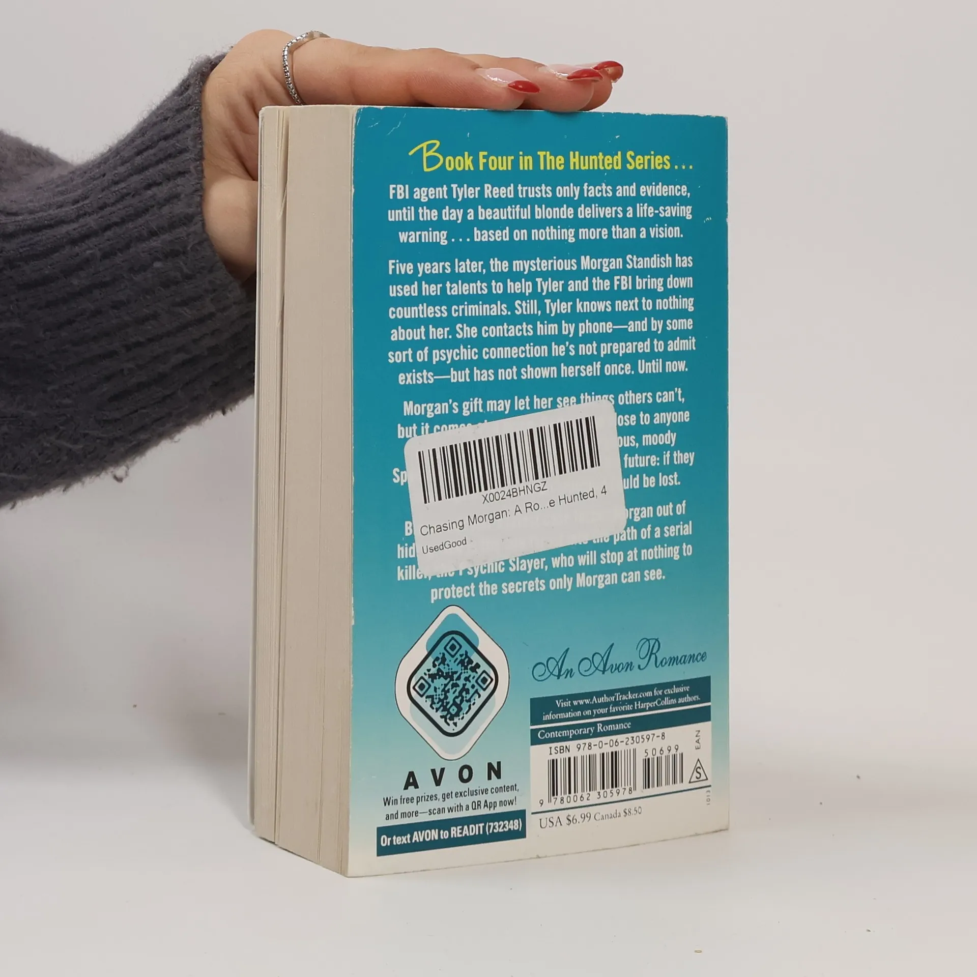 Book Four in The Hunted Series … FBI agent Tyler Reed trusts only facts and evidence, until the day a beautiful blonde delivers a life-saving warning ... based on nothing more than a vision. Five years later, the mysterious Morgan Standish has used her talents to help Tyler and the FBI bring down countless criminals. Still, Tyler knows next to nothing about her. She contacts him by phone—and by some sort of psychic connection he's not prepared to admit exists—but has not shown herself once. Until now. Morgan's gift may let her see things others can't, but it comes at a price. Getting too close to anyone is dangerous, especially the gorgeous, moody Special Agent Reed. For she's seen the future: if they meet again too soon, an innocent could be lost. But when Tyler's latest case forces Morgan out of hiding, she is the one thrust into the path of a serial killer, the Psychic Slayer, who will stop at nothing to protect the secrets only Morgan can see.