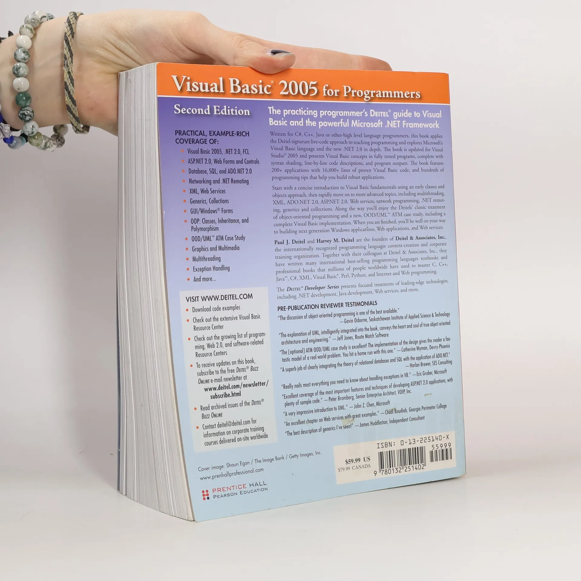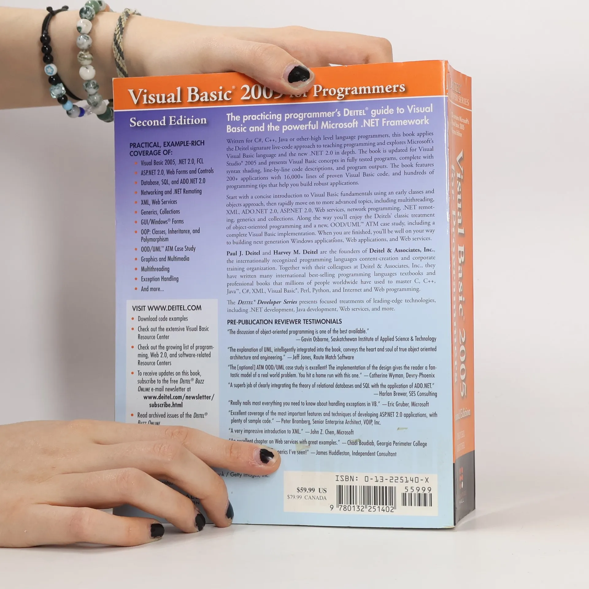 PRE-PUBLICATION REVIEWER TESTIMONIALS “The discussion of object-oriented programming is one of the best available.”—Gavin Osborne, Saskatchewan Institute of Applied Science & Technology “The explanation of UML, intelligently integrated into the book, conveys the heart and soul of true object oriented architecture and engineering.”—Jeff Jones, Route Match Software “The optional ATM OOD/UML case study is excellent! The implementation of the design gives the reader a fantastic model of a real world problem. You hit a home run with this one.”—Catherine Wyman, Devry-Phoenix “A superb job of clearly integrating the theory of relational databases and SQL with the application of ADO.NET.”—Harlan Brewer, SES Consulting “Really nails most everything you need to know about handling exceptions in VB.”—Eric Gruber, Microsoft “Excellent coverage of the most important features and techniques of developing ASP.NET 2.0 applications, with plenty of sample code.”—Peter Bromberg, Senior Enterprise Architect, VOIP, Inc. “A very impressive introduction to XML.”—John Z. Chen, Microsoft “An excellent chapter on Web services with great examples.”—Chadi Boudiab, Georgia Perimeter College “The best description of generics I’ve seen!”—James Huddleston, Independent Consultant The practicing programmer’s DEITEL ® guide to Visual Basic and the powerful Microsoft .NET Framework Written for C#, C++, Java or other-high level language programmers, this book applies the Deitel signature live-code approach to teaching programming and explores Microsoft’s Visual Basic language and the new .NET 2.0 in depth. The book is updated for Visual Studio ® 2005 and presents Visual Basic concepts in fully tested programs, complete with syntax shading, line-by-line code descriptions, and program outputs. The book features 200+ applications with 16,000+ lines of proven Visual Basic code, and hundreds of programming tips that help you build robust applications. Start with a concise introduction to Visual Basic fundamentals using an early classes and objects approach, then rapidly move on to more advanced topics, including multithreading, XML, ADO.NET 2.0, ASP.NET 2.0, Web services, network programming, .NET remoting, generics and collections. Along the way you’ll enjoy the Deitels’ classic treatment of object-oriented programming and a new, OOD/UML ™ ATM case study, including a complete Visual Basic implementation. When you are finished, you’ll be well on your way to building next generation Windows applications, Web applications, and Web services. Paul J. Deitel and Harvey M. Deitel are the founders of Deitel & Associates, Inc. , the internationally recognized programming languages content-creation and corporate training organization. Together with their colleagues at Deitel & Associates, Inc., they have written many international best-selling programming languages textbooks and professional books that millions of people worldwide have used to master C, C++, Java ™ , C#, XML, Visual Basic ® , Perl, Python, and Internet and Web programming. The DEITEL ® Developer Series presents focused treatments of leading-edge technologies, including .NET development, Java development, Web services, and more. Practical, Example-Rich Coverage