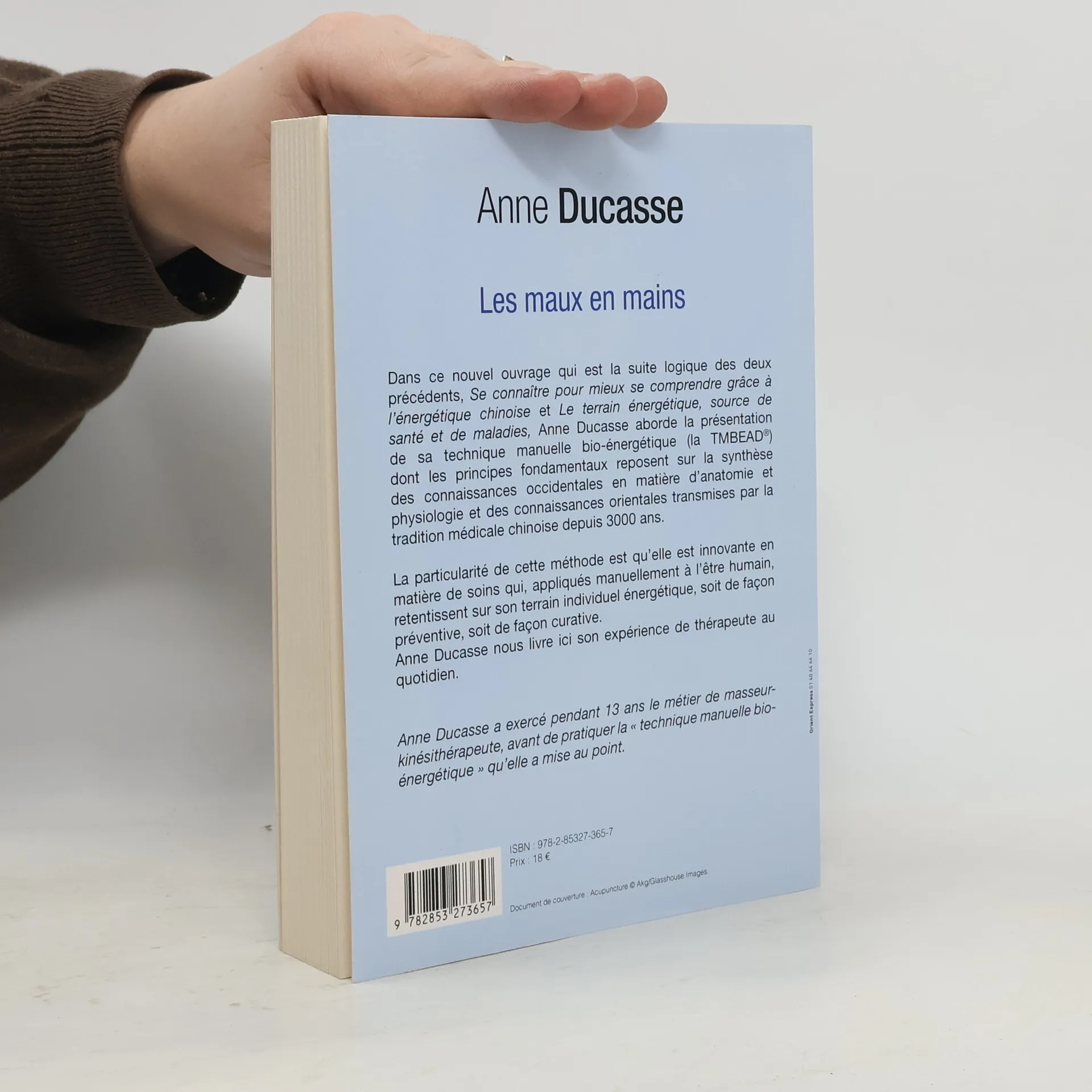 Dans son premier livre : Se connaître pour mieux se comprendre grâce à l’énergétique chinoise, paru en 2008 aux éditions Médicis, Anne Ducasse, explique l’organisation et le fonctionnement du plan énergétique ainsi que les lois qui l’animent. Elle présente l’être humain en tant qu’unité indivisible où matière, énergie et psychisme sont indissociables et en interrelations permanentes. Dans le deuxième ouvrage : le terrain énergétique, source de santé et de maladies, elle développe la notion de terrain énergétique, si difficile à appréhender pour notre mode de pensée occidental, et montre que l’état du terrain individuel est source de santé quand il est en équilibre et source de maladies, quand il ne l’est plus. Dans ce nouvel ouvrage qui est la suite logique des deux précédents, Anne Ducasse, aborde la présentation de sa technique manuelle bio énergétique dont les principes fondamentaux reposent sur la synthèse des connaissances occidentales en matière d’anatomie et physiologie et des connaissances orientales transmises par la Tradition Médicale Chinoise depuis 3000 ans. La particularité de cette méthode est qu’elle est innovante en matière de soins qui, appliqués manuellement à l’être humain, retentissent sur son terrain individuel énergétique, soit de façon préventive, soit de façon curative. Anne Ducasse, nous livre ici, son expérience de thérapeute au quotidien.