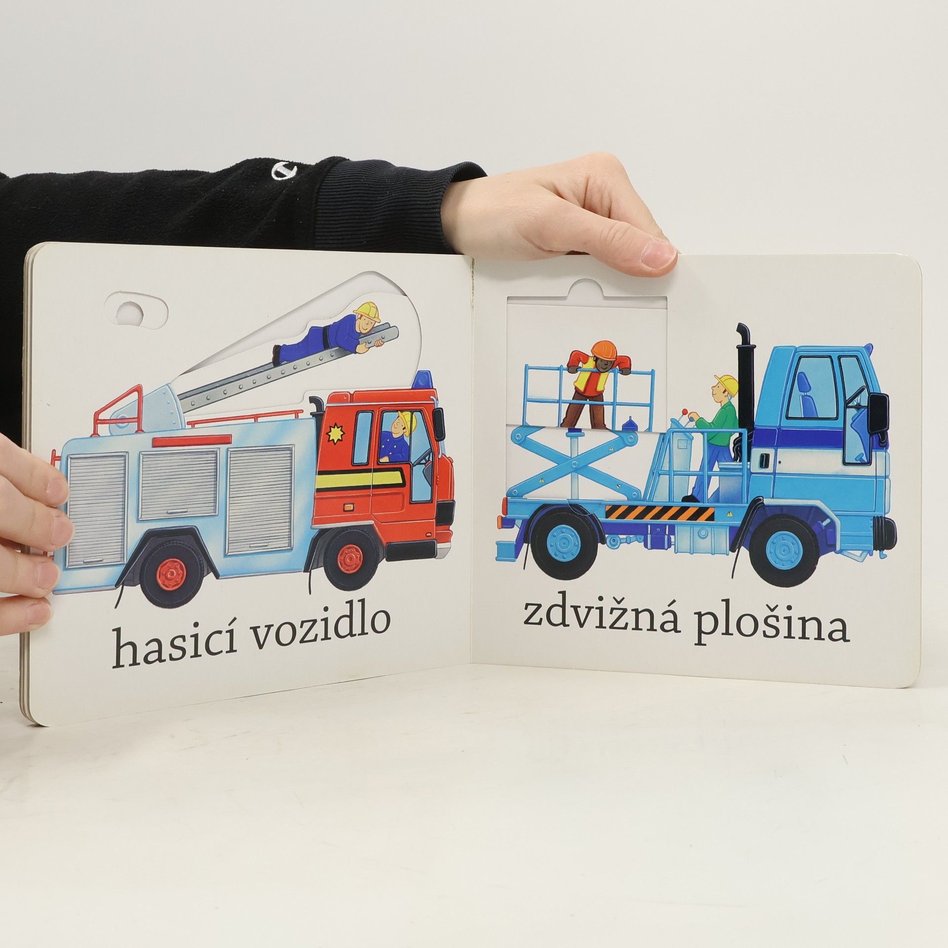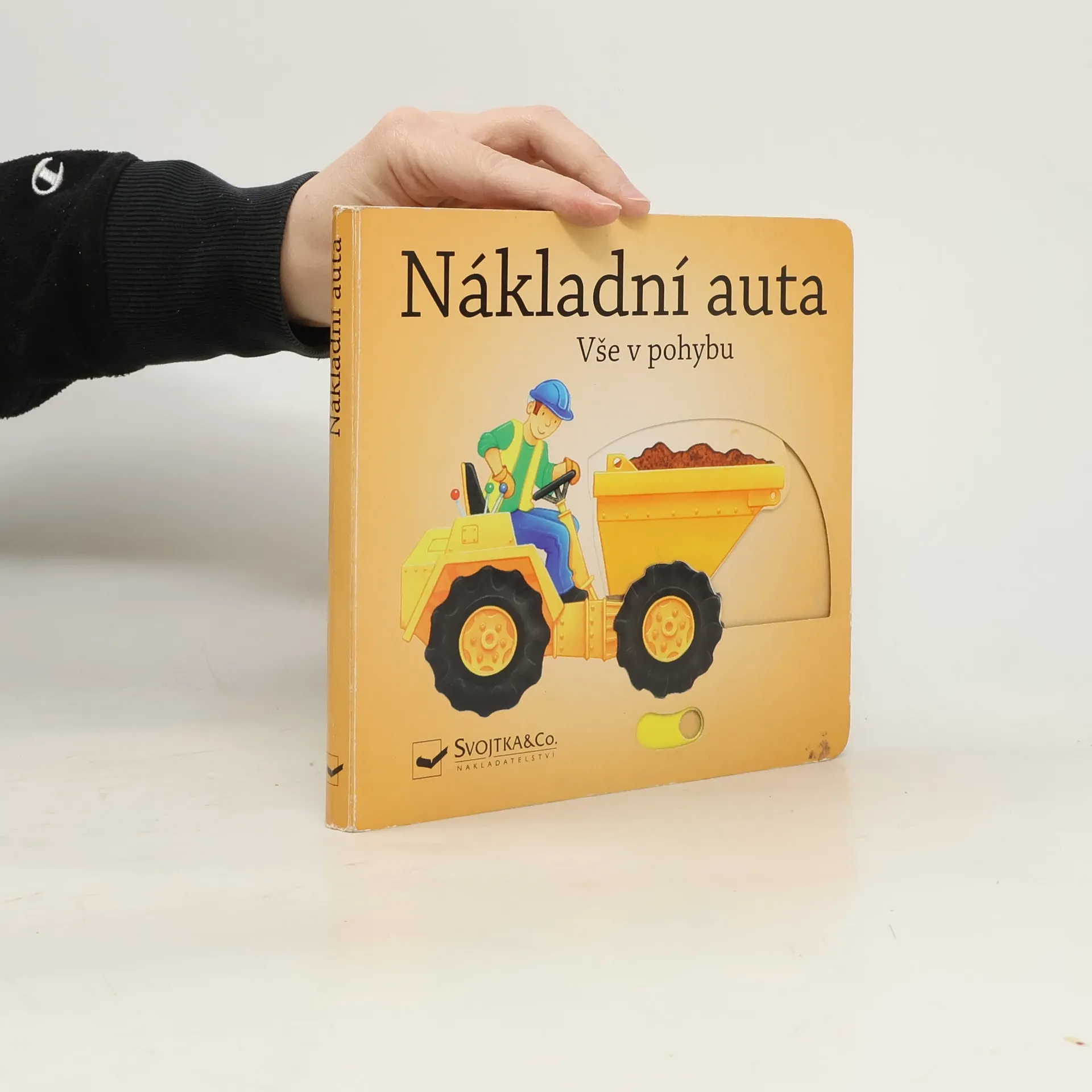 Toto leporelo je určeno pro nejmenší děti a pro jejich nenechavé prstíky. Obsahuje názorné, veselé, barevné obrázky různých nákladních aut a stavebních strojů, jejichž části se pomocí jednoduché manipulace "dají do pohybu".