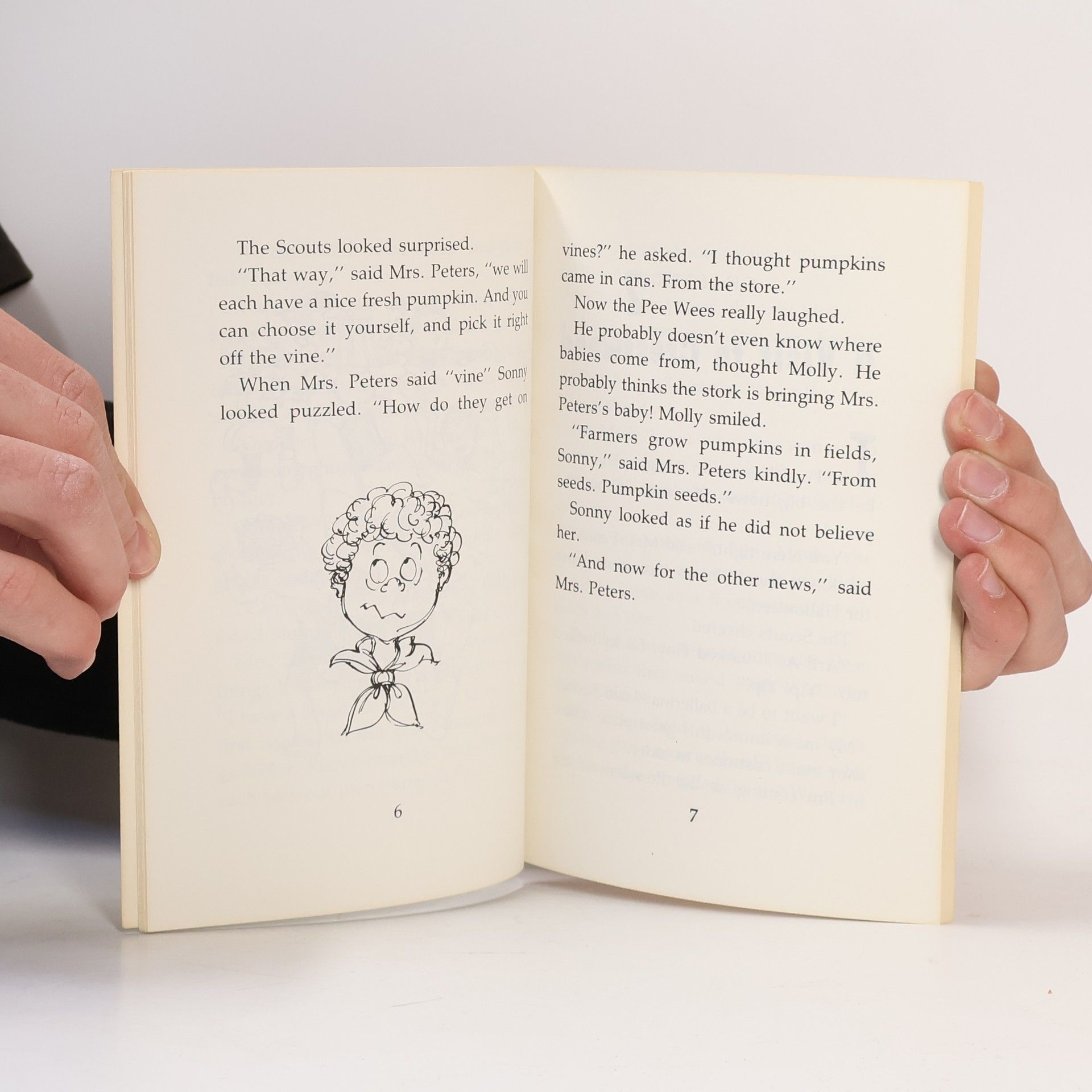 Halloween is here. Parties, costumes, pumpkins. The Pee Wee Scouts listen to Mrs. Peters, their troop leader, tell them all about the holiday plans. First, a trip to Mr. Riley's pumpkin farm. Next, carving the pumpkins with a safe tool. Then, the big Halloween party! Molly Duff is so excited about the fun and the food and games that the Pee Wees will play. She even plans her own special good deed. But when Mrs. Peters tells the Pee Wees where the Halloween party will be, Molly almost cries. Oh, no! Not there. Bad news for Molly means grumpy pumpkins everywhere.