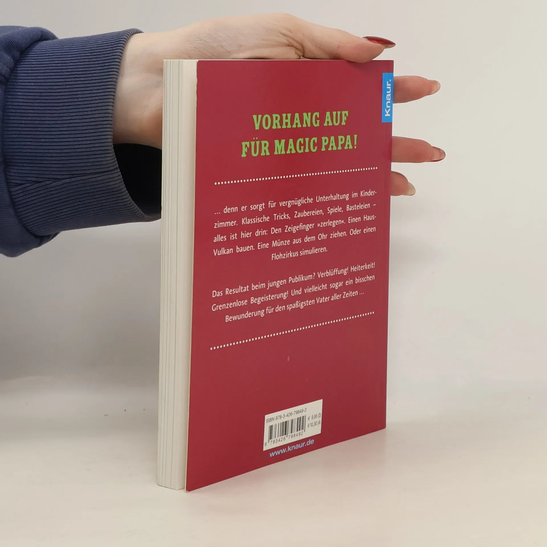 Vorhang auf für Magic Papa! … denn er sorgt für vergnügliche Unterhaltung im Kinderzimmer. Klassische Tricks, Zaubereien, Spiele, Basteleien – alles ist hier drin: Den Zeigefinger »zerlegen«. Einen Haus-Vulkan bauen. Eine Münze aus dem Ohr ziehen. Oder einen Flohzirkus simulieren. Das Resultat beim jungen Publikum? Verblüffung! Heiterkeit! Grenzenlose Begeisterung! Und vielleicht sogar ein bisschen Bewunderung für den spaßigsten Vater aller Zeiten…