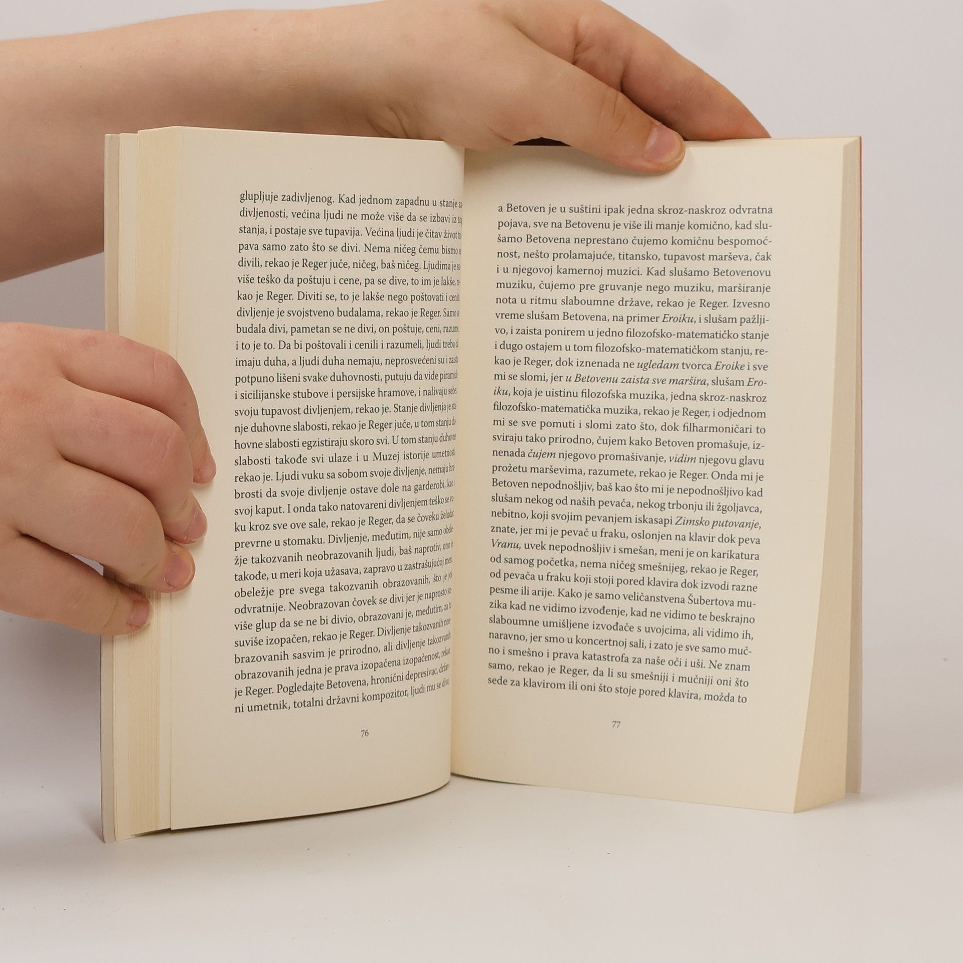 „... današnji čovek je izložen, nezaštićen, danas imamo jednog skroz-naskroz izloženog, nezaštićenog čoveka, do pre samo desetak godina ljudi su se osećali koliko-toliko zaštićeno, ali danas su prepušteni potpunoj nezaštićenosti, rekao je Reger u Ambasadoru. Nemaju gde da se sakriju, nikakvo skrovište više ne postoji, to je ono strašno, rekao je Reger, sve je postalo skroz-naskroz vidljivo i samim tim potpuno nezaštićeno; to znači da čovek danas ne može nigde više da pobegne, danas svuda, bez obzira gde su, ljude proganjaju i love, i oni moraju da beže i sklanjaju se i ne nalaze više nikakvu rupu u koju bi mogli da se zavuku, sem da pobegnu u smrt, to je činjenica, rekao je Reger, to je jezivo, jer svet više nije prijatno mesto, već je samo jezivo mesto. Morate da se pomirite s tim jezivim svetom, Acbaheru, hteli to ili ne hteli, skroz-naskroz ste prepušteni tom jezivom svetu, ako vas ubeđuju u suprotno, onda vas ubeđuju u laž, tom lažju vam danas neprekidno pune uši, u tome su najveštiji pre svega političari i politički brbljivci, rekao je Reger. Svet je užas svoje vrste u kom nijedan čovek više ne nalazi zaštitu, ni jedan jedini, tako je rekao Reger u Ambasadoru.“