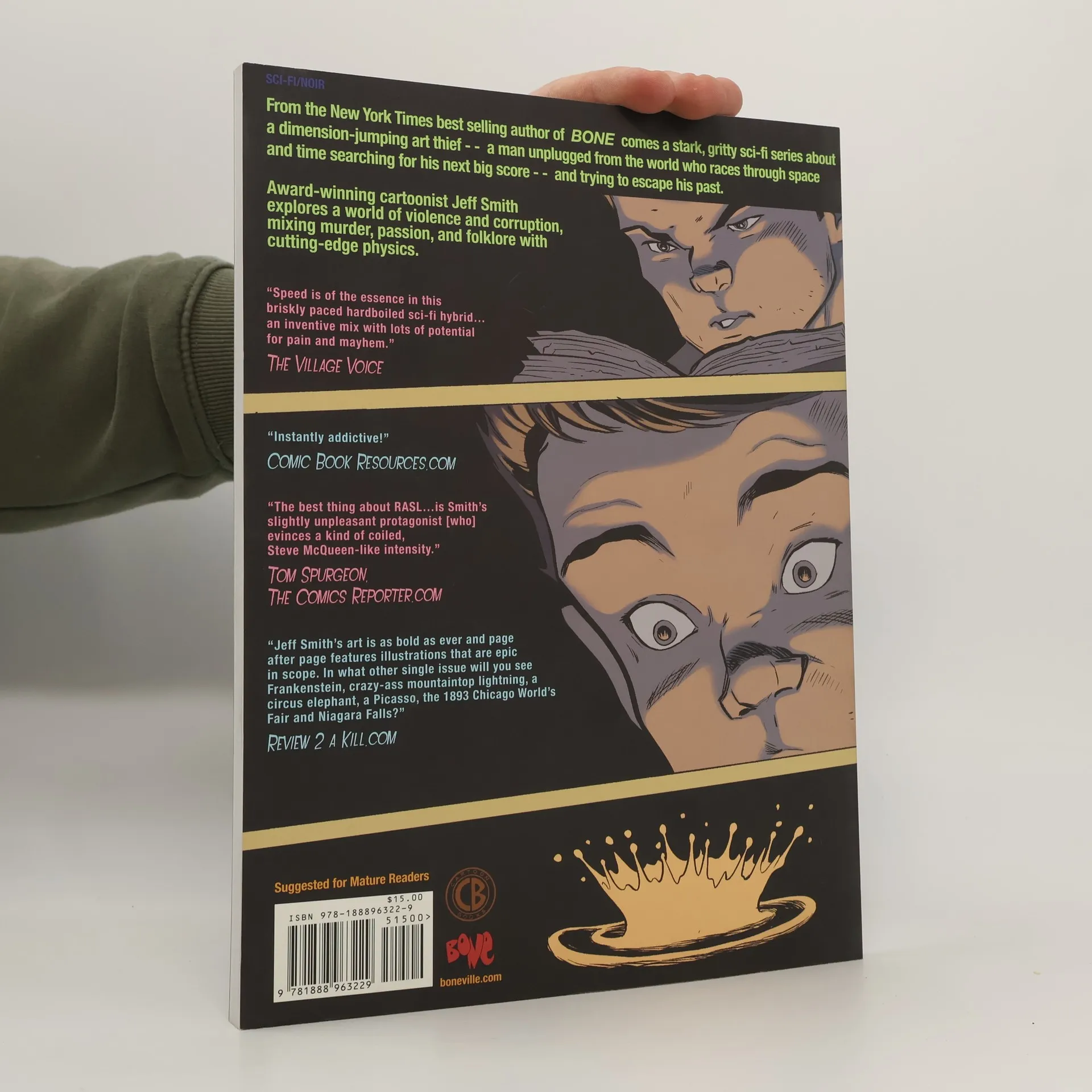 Jeff Smith's fast-paced sci-fi thriller about an inter-dimensional art thief continues in this action-packed graphic novel. The secrets of RASL's technology and his hidden past are exposed when a mysterious, lizard-faced stranger starts killing the art thief's girlfriends in multiple universes. The stranger knows that RASL used to work for the military-industrial complex on a project code-named The St. George Array, and believes that RASL has stolen secrets that will unlock the power of the universe. Collects RASL issues #4-7.