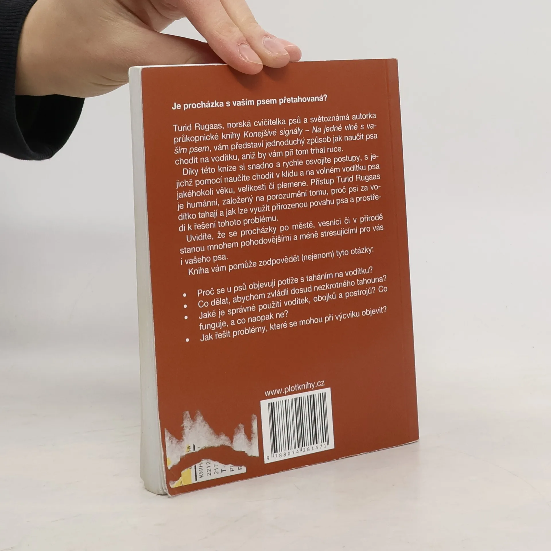 Turid Rugaas, norská cvičitelka psů a světoznámá autorka průkopnické knihy Konejšivé signály – Na jedné vlně s vaším psem, vám představí jednoduchý způsob jak naučit psa chodit na vodítku, aniž by vám při tom trhal ruce. Díky této knize si snadno a rychle osvojíte postupy, s jejichž pomocí naučíte chodit v klidu a na volném vodítku psa jakéhokoli věku, velikosti či plemene. Přístup Turid Rugaas je humánní, založený na porozumění tomu, proč psi za vodítko tahají a jak lze využít přirozenou povahu psa a prostředí k řešení tohoto problému. Uvidíte, že se procházky po městě, vesnici či v přírodě stanou mnohem pohodovějšími a méně stresujícími pro vás i vašeho psa.