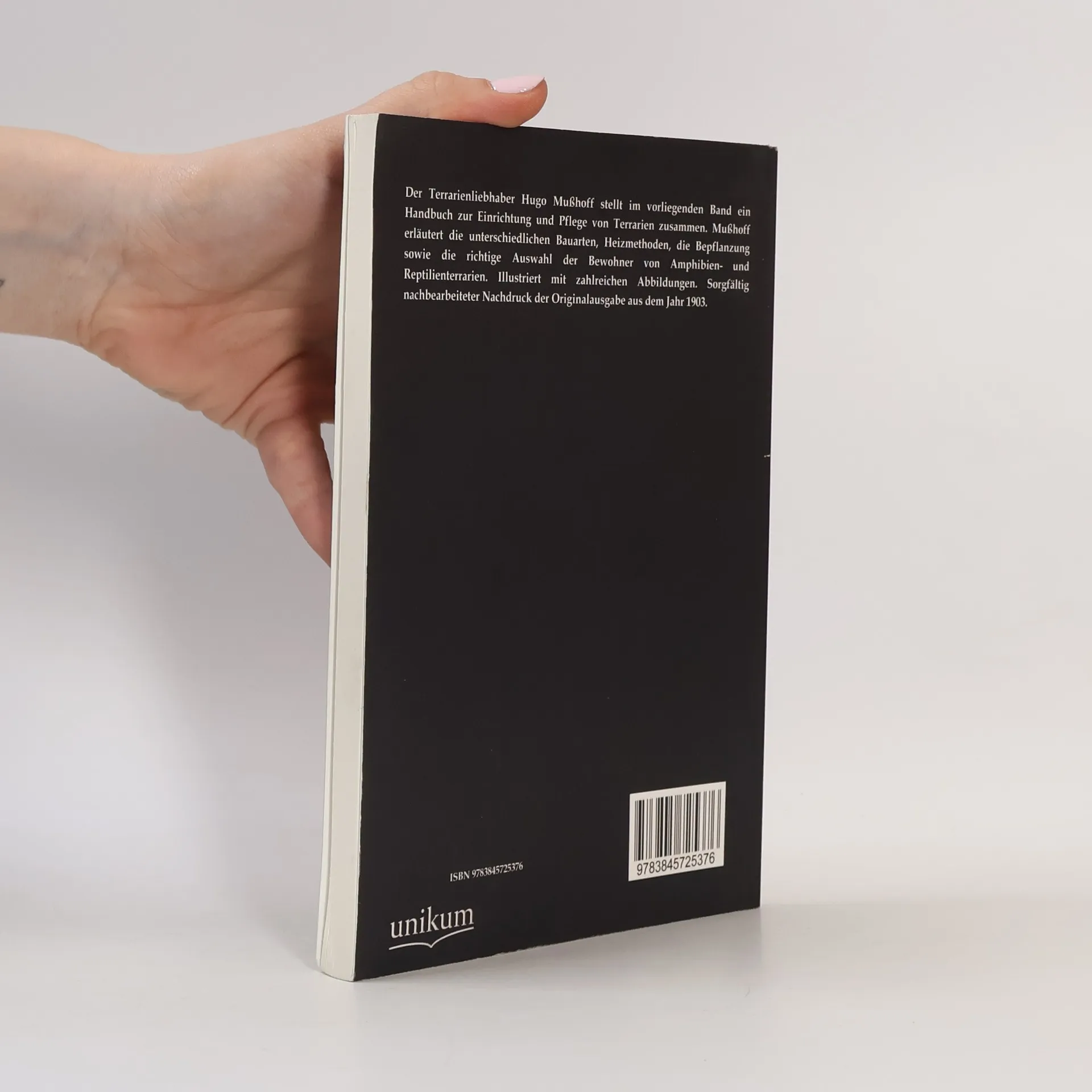 Der Terrarienliebhaber Hugo Mußhoff bietet ein umfassendes Handbuch zur Einrichtung und Pflege von Terrarien. Er erklärt Bauarten, Heizmethoden, Bepflanzung und die Auswahl geeigneter Amphibien- und Reptilienbewohner. Das Werk ist reich illustriert und als sorgfältig nachbearbeiteter Nachdruck von 1903 erhältlich.