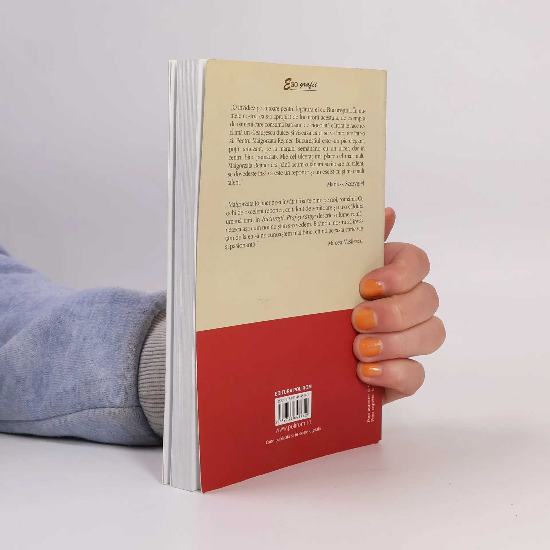 Malgorzata Rejmer a realizat o serie de reportaje despre București și societatea românească, împletind trei planuri temporale: România contemporană, perioada comunistă și cea interbelică. Volumul surprinde un prezent aspru și un trecut dramatic, reamintind aspecte esențiale precum reeducarea prin tortură, sistemul totalitar, interzicerea avorturilor și tragediile care au urmat. De la prigoana comunistă la ascensiunea lui Ceaușescu, de la Casa Poporului și colectivizare până la corupție și problemele sociale, toate acestea sunt prezentate cu o prospețime și obiectivitate remarcabile. Rejmer reușește să se apropie de locuitorii Bucureștiului, surprinzând nu doar realitățile dure, ci și nuanțele vieții cotidiene. Criticii subliniază legătura autoarei cu orașul, descriind Bucureștiul ca fiind „un pic elegant, puțin amuzant, dar cu margini ce seamănă cu un ulcer”. Rejmer, deja recunoscută ca o tânără scriitoare talentată, se dovedește a fi și un reporter și eseist cu un talent și mai mare. Această carte oferă o privire profundă asupra unei lumi românești pe care mulți nu o percep în mod corect, invitând cititorii să se cunoască mai bine prin intermediul acestei narațiuni captivante.