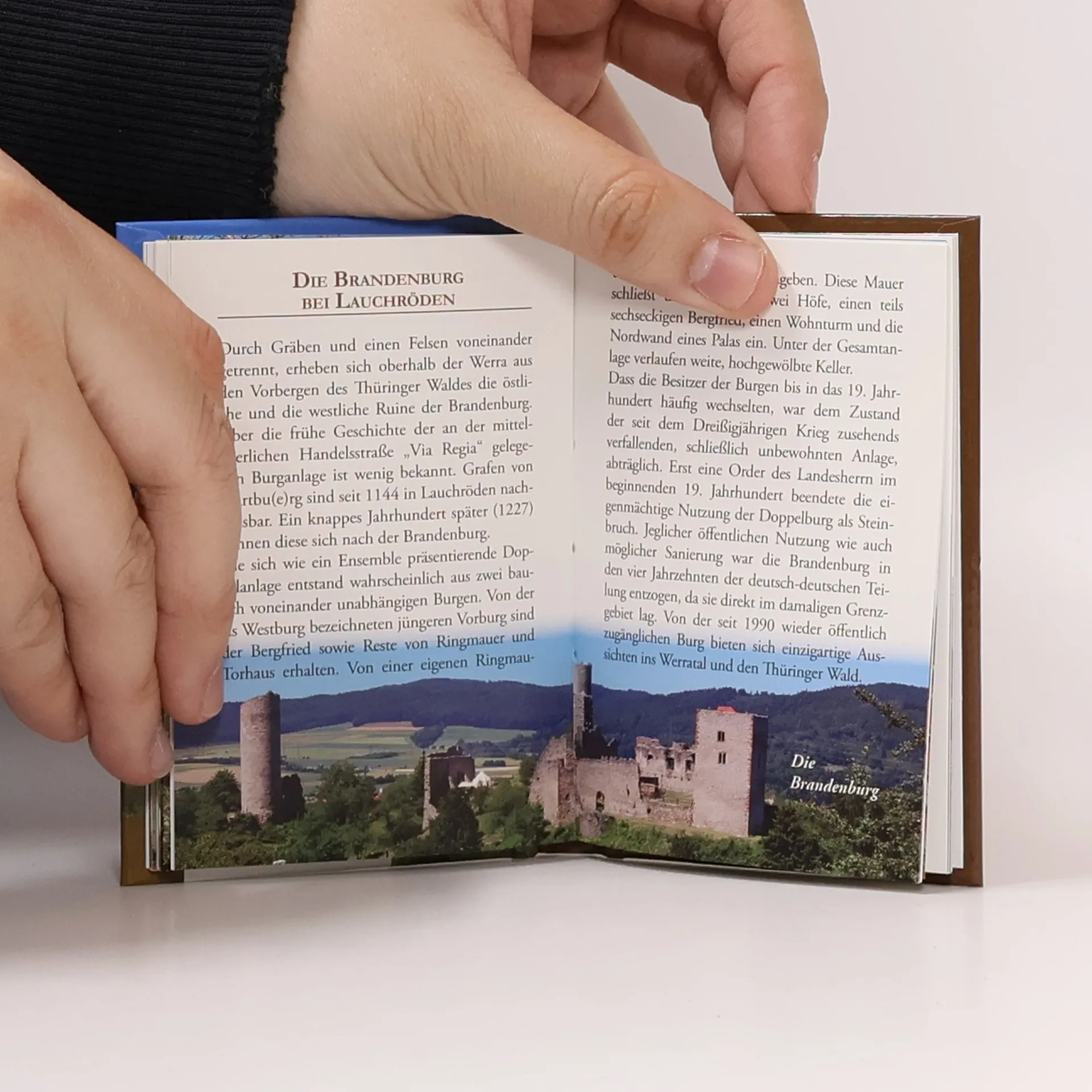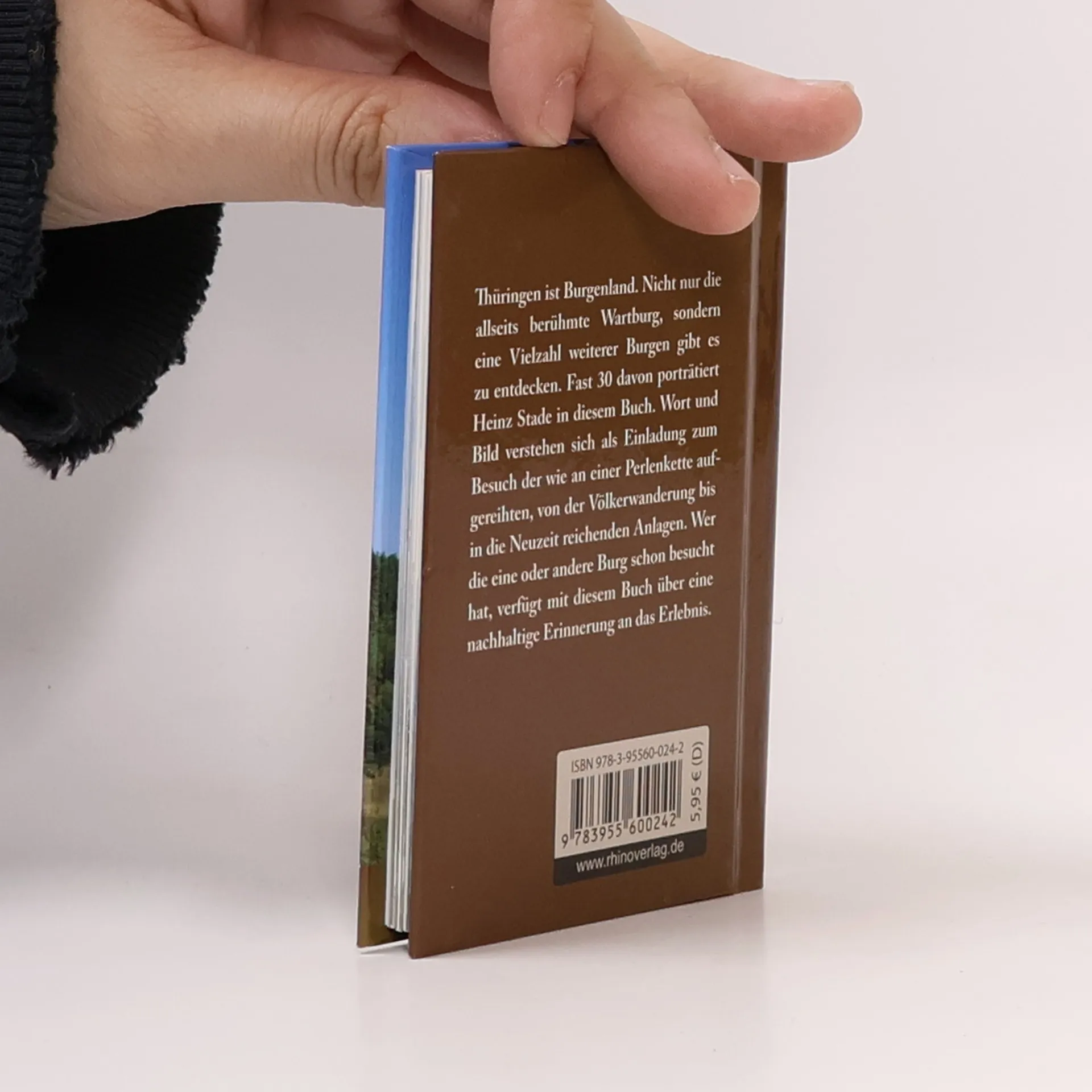 Rund 800 Burgen, Burgruinen und ehemals befestigte burgähnliche Anlagen sind in Thüringen bekannt. Das Land zwischen Unstrut, Werra und Saale war seit jeher ein Durchgangsland aber auch lange Zeit Grenzland zu den benachbarten slawischen Gebieten. Für uns Heutige gehören Burgen zum Landschaftsbild. Romantiker haben die alten Gemäuer mit Sagen umwoben. Die Geschichtsinteressierten wissen um ihre politische Bedeutung. In jedem Fall ringen sie dem Besucher Respekt für die bauliche Leistung unserer Vorfahren ab. Das Buch beschreibt eine Auswahl von 28 Burgen und Burgruinen – bekannte wie die Wartburg, die Reichsburg Kyffhausen oder die Leuchtenburg aber auch solche, die erst in letzter Zeit in den Focus der Öffentlichkeit gelangten. Auf jeden Fall sind sie es alle Wert, dass wir ihnen unsere Aufwartung machen. Das Buch erschien in der inzwischen 31-bändigen Rhino Westentaschen-Bibliothek. Die „Kleinen Rhinos“ sind kleine, feine Geschenkbücher mit einem breiten Themenspektrum und vermitteln prägnante, kurzweilige und anschaulich bebilderte Informationen. Dazu gehören wichtige Ratgeber-Themen wie Gesundheit und Essen aber auch Themen mit unterhaltend-informativem Charakter und regionale Themen mit überregionaler Ausstrahlung.