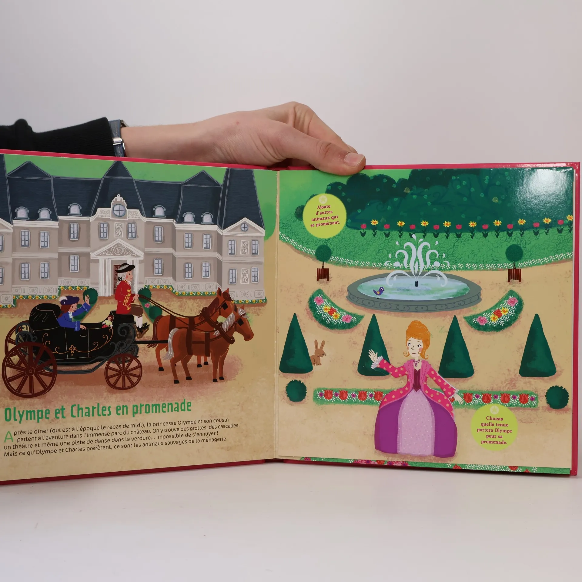 En compagnie de la princesse Olympe et de son cousin Charles, découvre la vie de château ! Au fil de décors fastueux, partage toute une journée avec eux. Aide la princesse à s’habiller, pars à la rencontre des courtisans et des mousquetaires que Charles admire tant, apprends les leçons de bonne tenue, promène-toi dans le jardin à la française peuplé d’étonnants animaux et découvre quels étaient leurs jeux préférés. Une belle journée qui se terminera par un magnifique bal donné en l’honneur de la princesse !