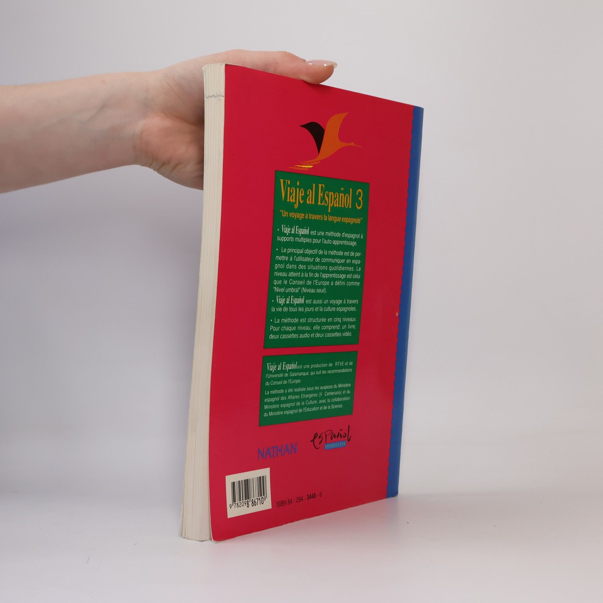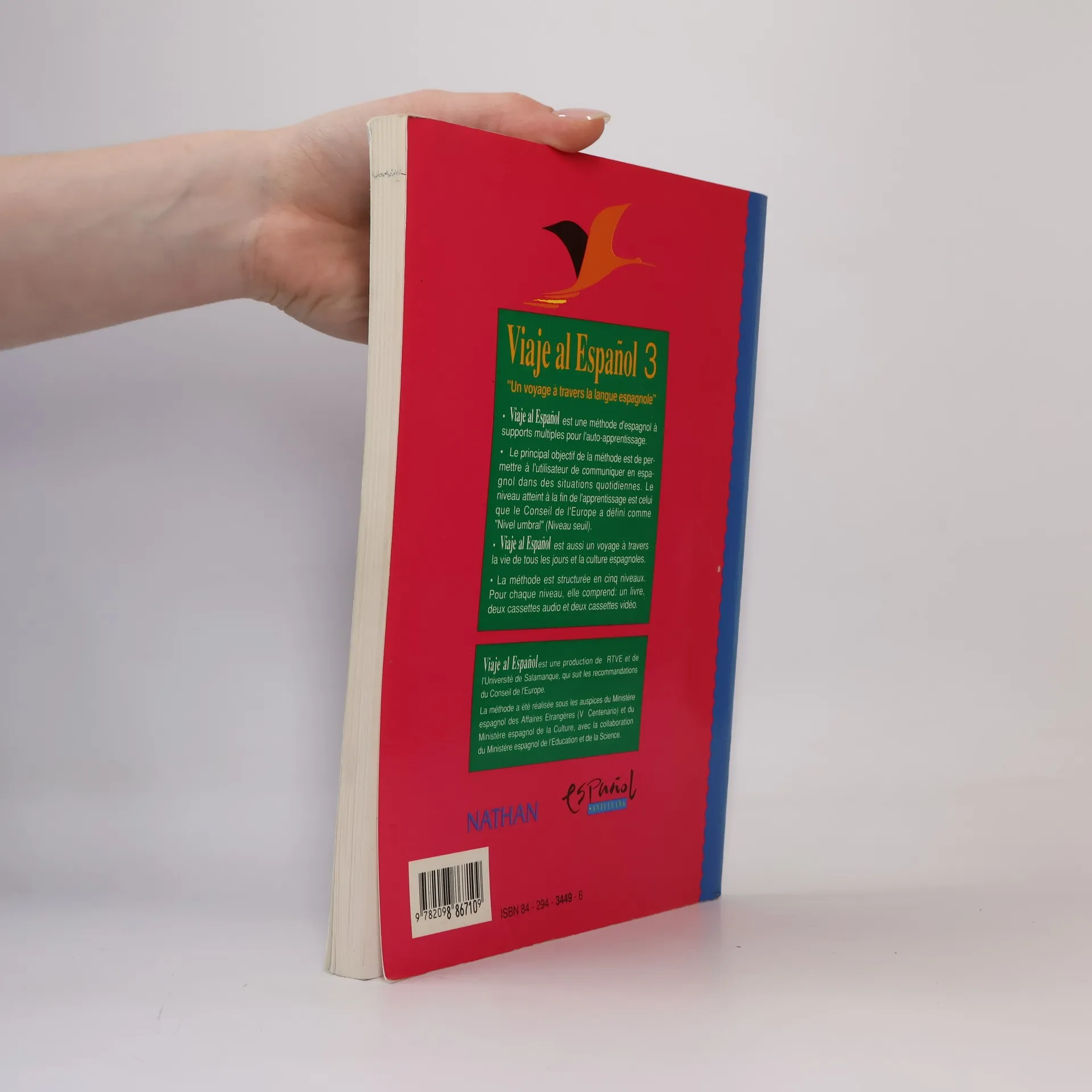 Viaje al Espanol est une méthode d'espagnol à supports multiples pour l'auto-apprentissage. Le principal objectif de la méthode est de permettre à l'utilisateur de communiquer en espagnol dans des situations quotidiennes. Le niveau atteint à la fin de l'apprentissage est celui que le Conseil de l'Europe a défini comme " Nivel Umbral " (Niveau Seuil). Viaje al Espanol est aussi un voyage à travers la vie de tous les jours et la culture espagnoles. La méthode est structurée en cinq niveaux. Pour chaque niveau, elle comprend : un livre, deux cassettes audio et deux cassettes vidéo.