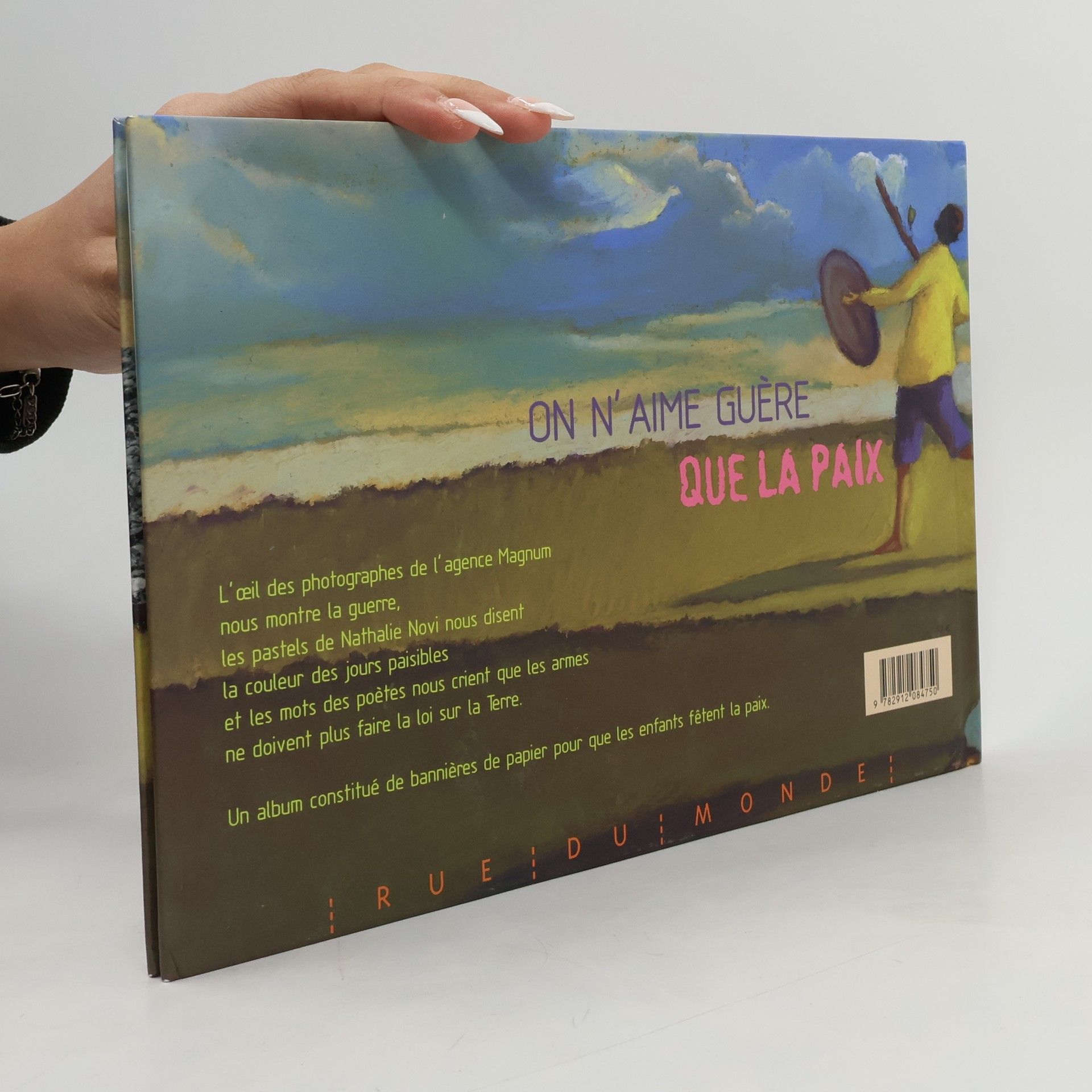 L'œil des photographes de l'agence Magnum nous montre la guerre, les pastels de Nathalie Novi nous disent la couleur des jours paisibles et les mots des poètes nous crient que les armes ne doivent plus faire la loi sur la Terre. Un album constitué de bannières de papier pour que les enfants fêtent la paix.