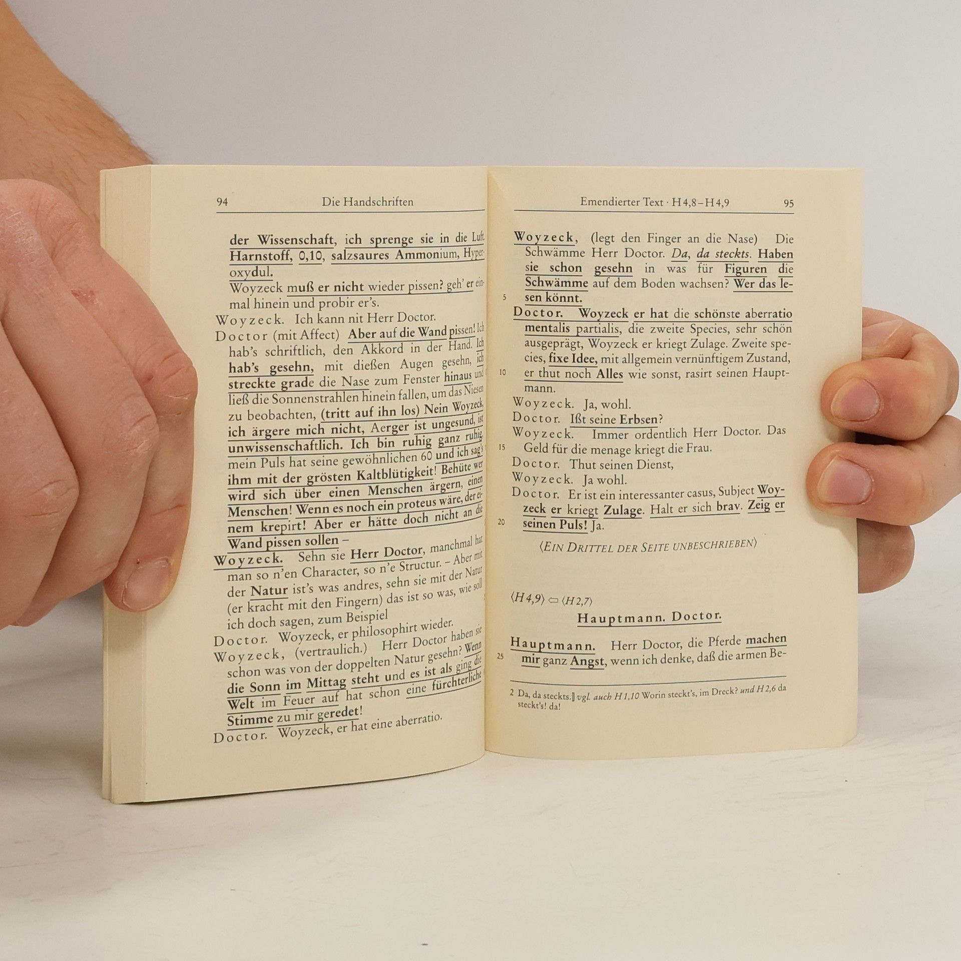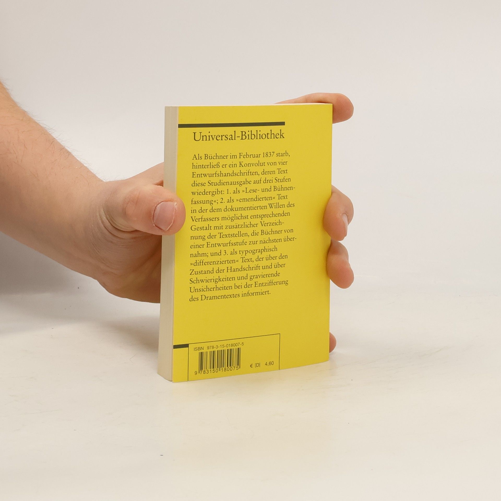 Als Büchner im Februar 1837 starb, hinterließ er ein Konvolut von vier Entwurfshandschriften, deren Text diese Studienausgabe auf drei Stufen wiedergibt: 1. als »Lese- und Bühnenfassung«; 2. als »emendierten« Text in der dem dokumentierten Willen des Verfassers möglichst entsprechenden Gestalt mit zusätzlicher Verzeichnung der Textstellen, die Büchner von einer Entwurfsstufe zur nächsten übernahm; und 3. als typographisch »differenzierten« Text, der über den Zustand der Handschrift und über Schwierigkeiten und gravierende Unsicherheiten bei der Entzifferung des Dramentextes informiert.