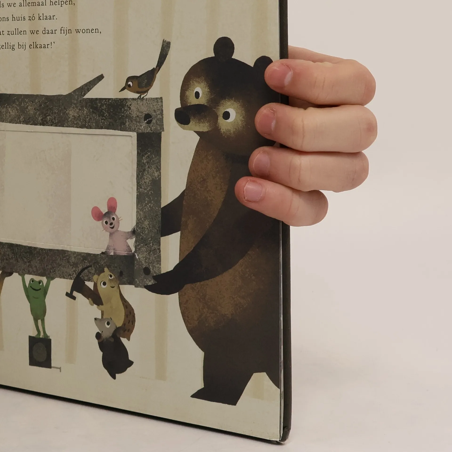 Muis wil een mooi, groot huis bouwen. Hij ontdekt dat veel dieren in het bos hun huis zijn kwijtgeraakt. Iedereen mag meehelpen en samen bouwen ze een huis voor alle dieren. Oblong prentenboek met illustraties in natuurlijke kleuren, met kijkgaten, afgesneden pagina's en tekst op rijm. Vanaf ca. 4 jaar.