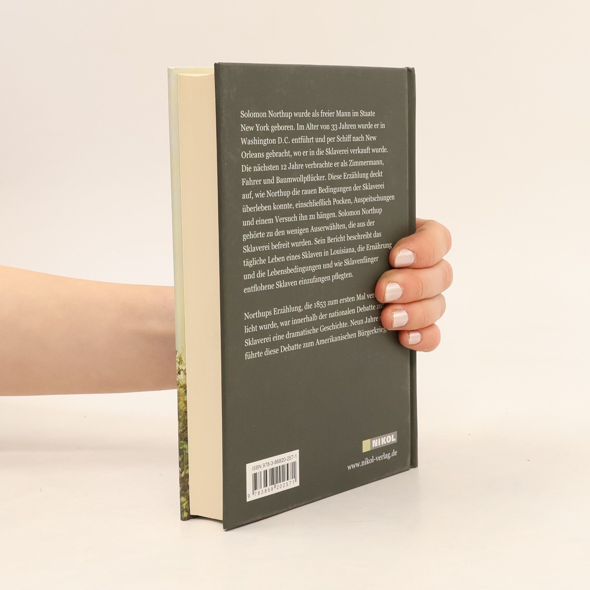 Solomon Northup wurde als freier Mann im Staate New York geboren. Im Alter von 33 Jahren wurde er in Washington D. C. entführt und per Schiff nach New Orleans gebracht, wo er in die Sklaverei verkauft wurde. Die nächsten 12 Jahre verbrachte er als Zimmermann, Fahrer und Baumwollpflücker. Diese Erzählung deckt auf, wie Northup die rauen Bedingungen der Sklaverei überleben konnte, einschließlich Pocken, Auspeitschungen und einem Versuch ihn zu hängen. Solomon Northup gehörte zu den wenigen Auserwählten, die aus der Sklaverei befreit wurden. Sein Bericht beschreibt das tägliche Leben eines Sklaven in Louisiana, die Ernährung und die Lebensbedingungen und wie Sklavenfänger entflohene Sklaven einzufangen pflegten. Northups Erzählung, die 1853 zum ersten Mal veröffentlicht wurde, war innerhalb der nationalen Debatte zur Sklaverei eine dramatische Geschichte. Neun Jahre später führte diese Debatte zum Amerikanischen Bürgerkrieg.