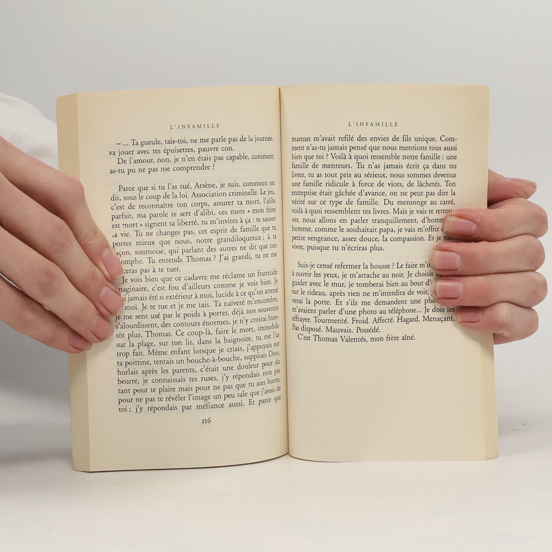Thomas est mort, son corps attend d’être reconnu dans une morgue. Son frère Guillaume se trouve investi de cette difficile mission. Thomas était écrivain, il transformait les récits familiaux en règlements de comptes, pillait allègrement au passage les souvenirs de Guillaume et révélait la barbarie ordinaire de la famille. Guillaume semble désormais le seul dépositaire de la mémoire familiale. Une mémoire sous l’emprise d’une subjectivité absolue, mêlant vérités et mensonges, et qui s’impose peu à peu comme un mythe menaçant. L’infamille met en scène des personnages en conflit avec un monde intérieur qui réduit l’identité à une filiation et un monde extérieur qui s’intéresse à la jeunesse pour ce qu’elle représente, et non pour ce qu’elle est. Le récit suit la trajectoire de ce mystère : à qui appartient-on lorsqu’on dit « appartenir à une famille » ?