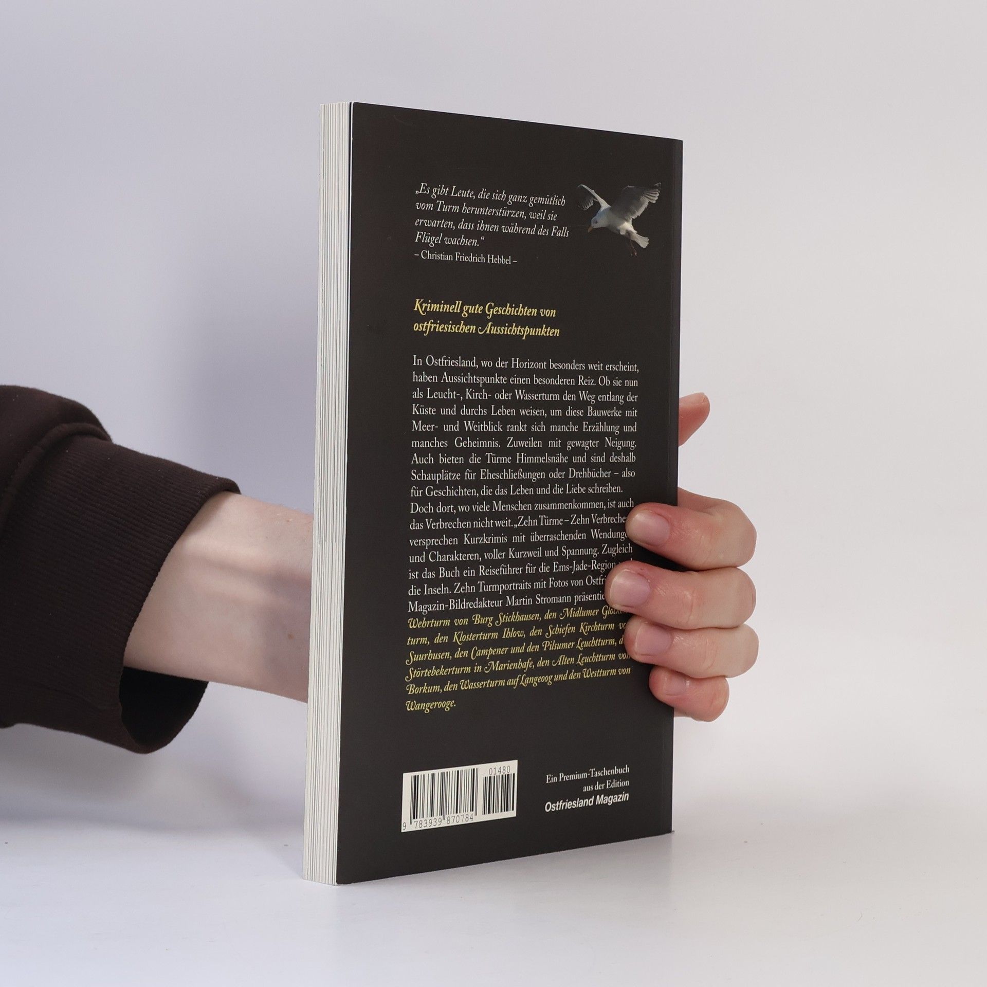 In Ostfriesland, where the horizon stretches far, viewpoints like lighthouses, church towers, and water towers hold a special allure. These structures, offering stunning sea and landscape views, are surrounded by intriguing tales and secrets, often with a daring twist. They also serve as venues for weddings and stories of life and love. However, where people gather, crime often lurks nearby. This crime anthology promises short mysteries filled with unexpected turns and engaging characters, offering both entertainment and suspense. Additionally, the book serves as a travel guide to the tower landscape of the Ems-Jade region and its islands. It features ten tower portraits accompanied by photographs from Martin Stromann, showcasing notable sites such as the Wehrturm von Burg Stickhausen, the Midlumer Glockenturm, and the Schiefen Kirchturm von Suurhusen, among others. Renowned local authors, including Grimme Prize winner Hans-Erich Vieth and thriller writer Usch Luhn, contribute to the collection. With its blend of crime stories and insights into Ostfriesland's viewpoints, this anthology is a captivating read for mystery enthusiasts and travelers alike.