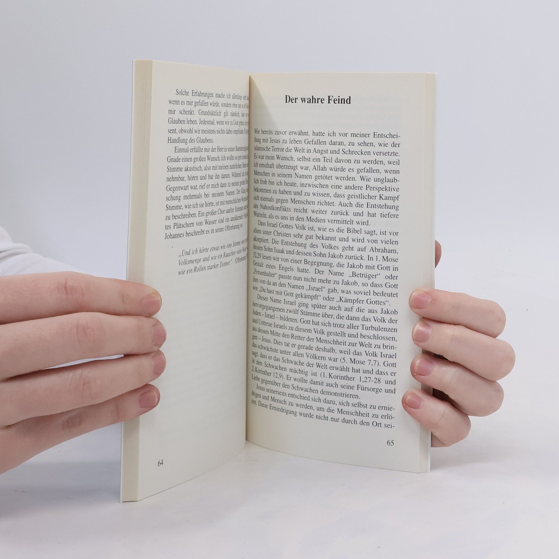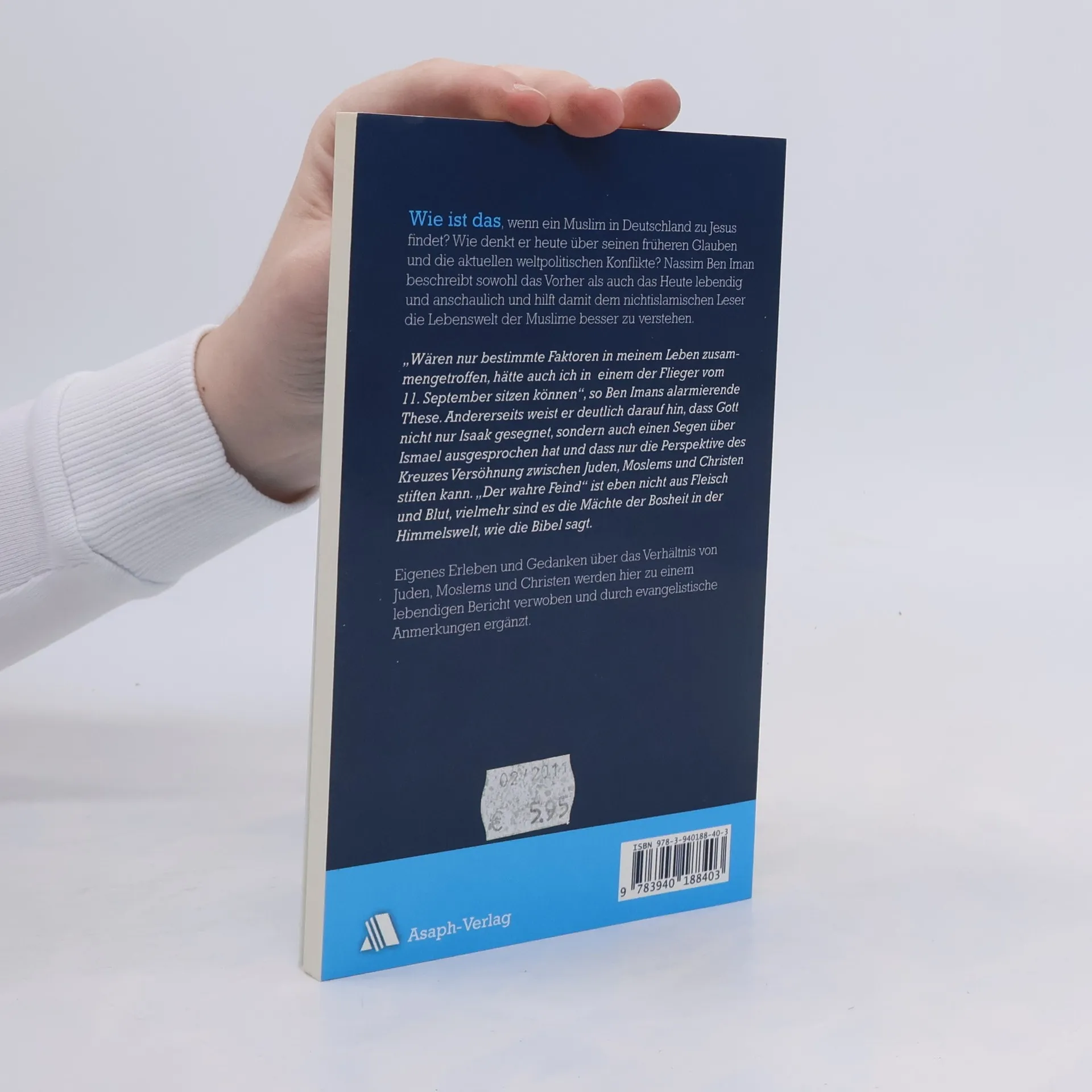Wie ist das, wenn ein Muslim in Deutschland zu Jesus findet? Wie denkt er heute über seinen früheren Glauben und die aktuellen weltpolitischen Konflikte? Nassim Ben Iman beschreibt sowohl das Vorher als auch das Heute lebendig und anschaulich und hilft damit dem nichtislamischen Leser die Lebenswelt der Muslime besser zu verstehen. -- „Wären nur bestimmte Faktoren in meinem Leben zusammengetroffen, hätte auch ich in einem der Flieger vom 11. September sitzen können“, so Ben Imans alarmierende These. Andererseits weist er deutlich darauf hin, dass Gott nicht nur Isaak gesegnet, sondern auch einen Segen über Ismael ausgesprochen hat und dass nur die Perspektive des Kreuzes Versöhnung zwischen Juden, Moslems und Christen stiften kann. „Der wahre Feind“ ist eben nicht aus Fleisch und Blut, vielmehr sind es die Mächte der Bosheit in der Himmelswelt, wie die Bibel sagt. -- Eigenes Erleben und Gedanken über das Verhältnis von Juden, Moslems und Christen werden hier zu einem lebendigen Bericht verwoben und durch evangelistische Anmerkungen ergänzt.