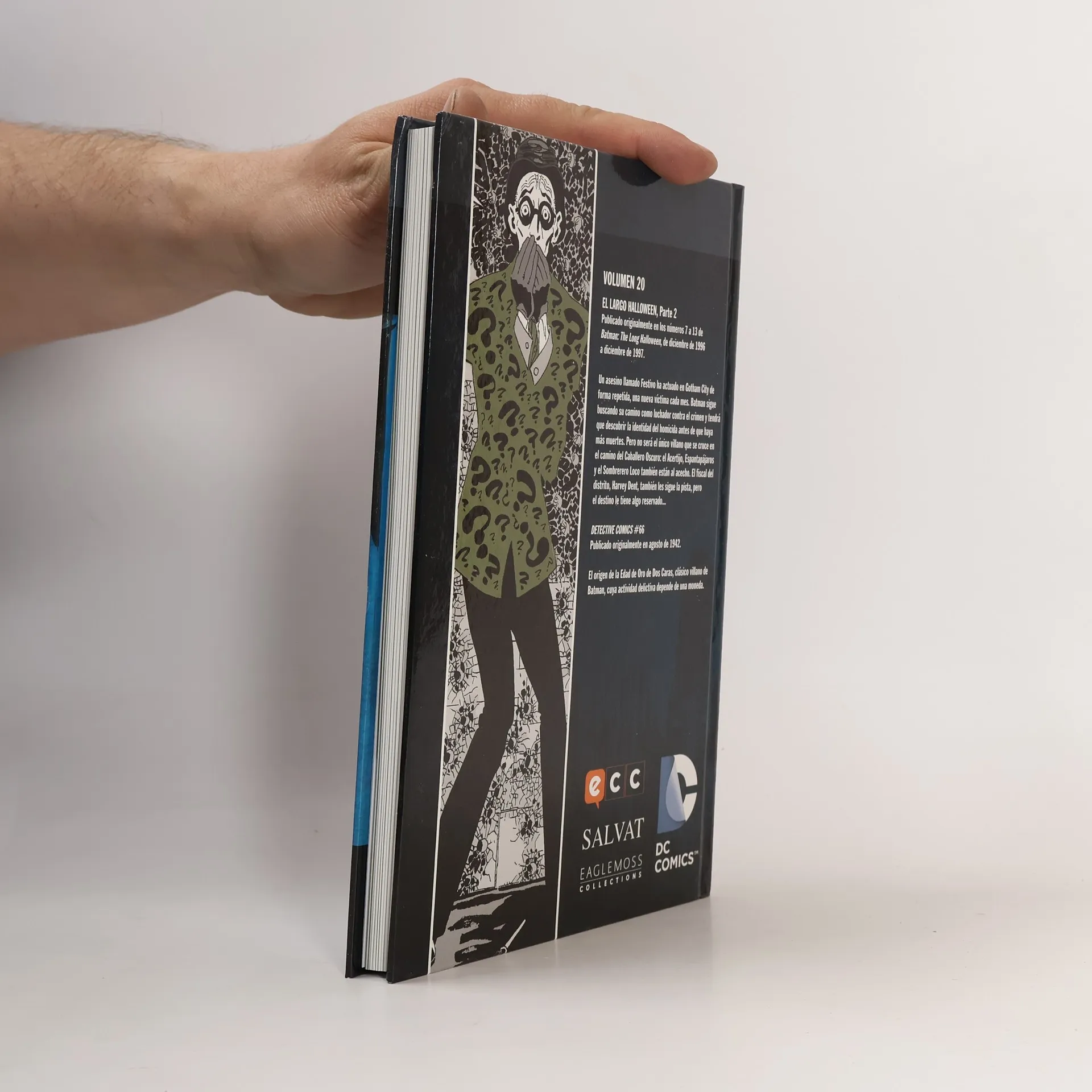 <b>VOLUMEN 20</b> <i>EL LARGO HALLOWEEN</i>, Parte 2 Publicado originalmente en los números 7 a 13 de <i>Batman: The Long Halloween</i>, de diciembre de 1996 a diciembre de 1997. Un asesino llamado Festivo ha actuado en Gotham City de forma repetida, una nueva víctima cada mes. Batman sigue buscando su camino como luchador contra el crimen y tendrá que descubrir la identidad del homicida antes de que haya más muertes. Pero no será el único villano que se cruce en el camino del Caballero Oscuro: el Acertijo, Espantapájaros y el Sombrerero Loco también están al acecho. El fiscal del distrito, Harvey Dent, también les sigue la pista, pero el destino le tiene algo reservado... <i>DETECTIVE COMICS</i> #66 Publicado originalmente en agosto de 1942. El origen de la Edad de Oro de Dos Caras, clásico villano de Batman, cuya actividad delictiva depende de una moneda.