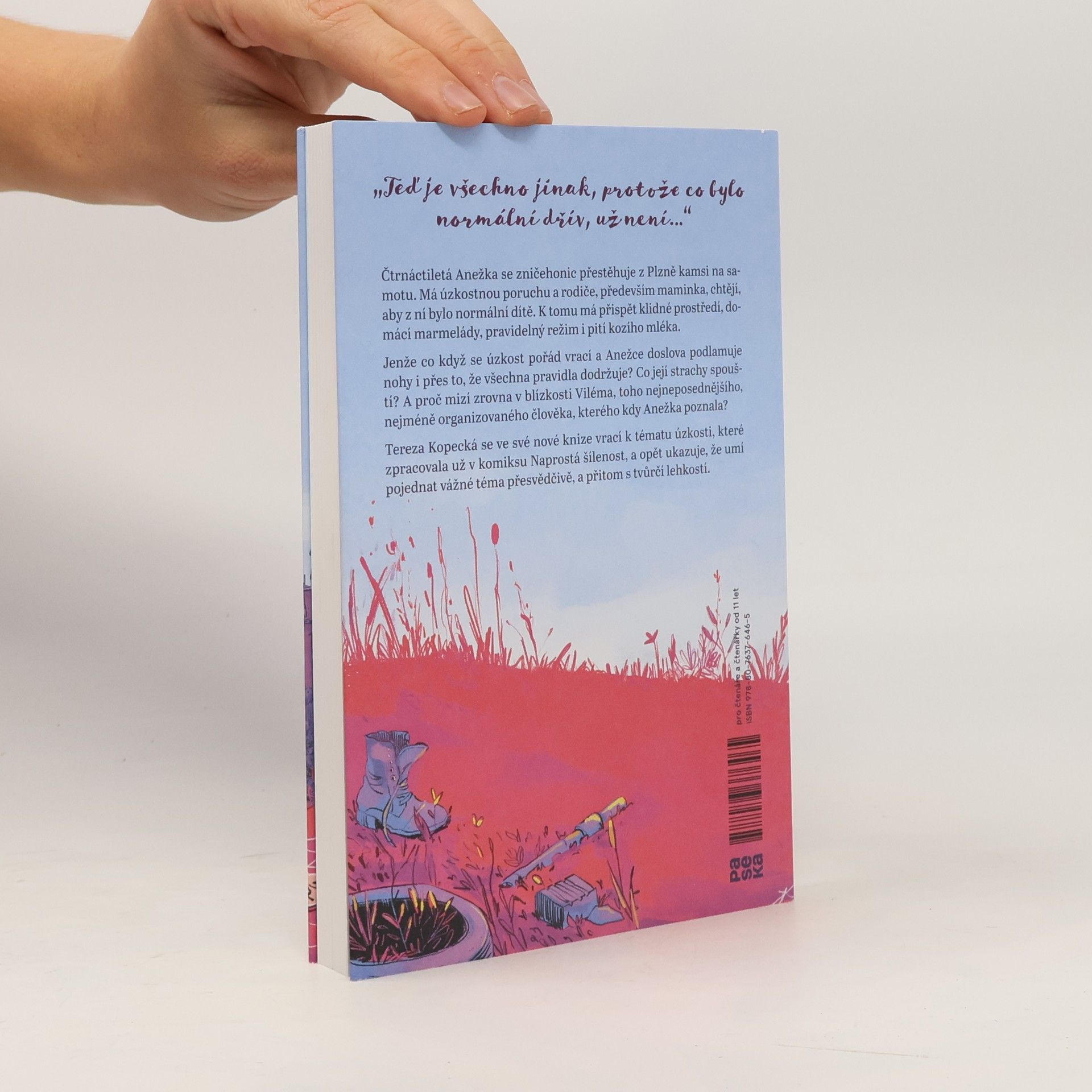 Čtrnáctiletá Anežka se zničehonic přestěhuje z Plzně kamsi na samotu. Má úzkostnou poruchu a rodiče, především maminka, chtějí, aby z ní bylo normální dítě. K tomu má přispět klidné prostředí, domácí marmelády, pravidelný režim i pití kozího mléka. Jenže co když se úzkost pořád vrací a Anežce doslova podlamuje nohy i přes to, že všechna pravidla dodržuje? Co její strachy spouští? A proč mizí zrovna v blízkosti Viléma, toho nejneposednějšího, nejméně organizovaného člověka, kterého kdy Anežka poznala? Tereza Kopecká se ve své nové knize vrací k tématu úzkosti, které zpracovala už v komiksu Naprostá šílenost, a opět ukazuje, že umí pojednat vážné téma přesvědčivě, a přitom s tvůrčí lehkostí. Tentokrát svůj román věnovala všem čtenářům a čtenářkám od 11 let.